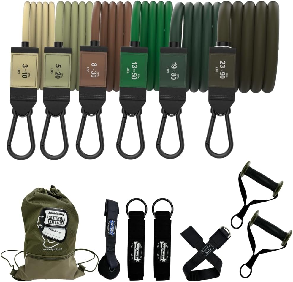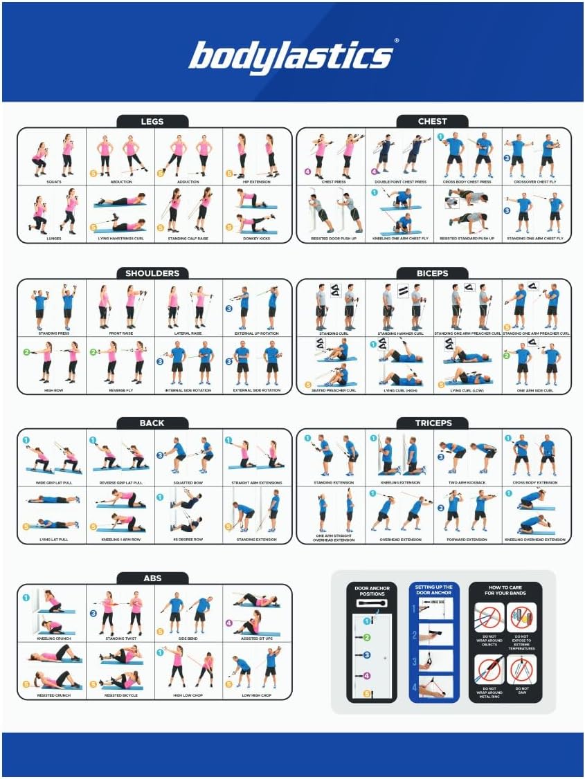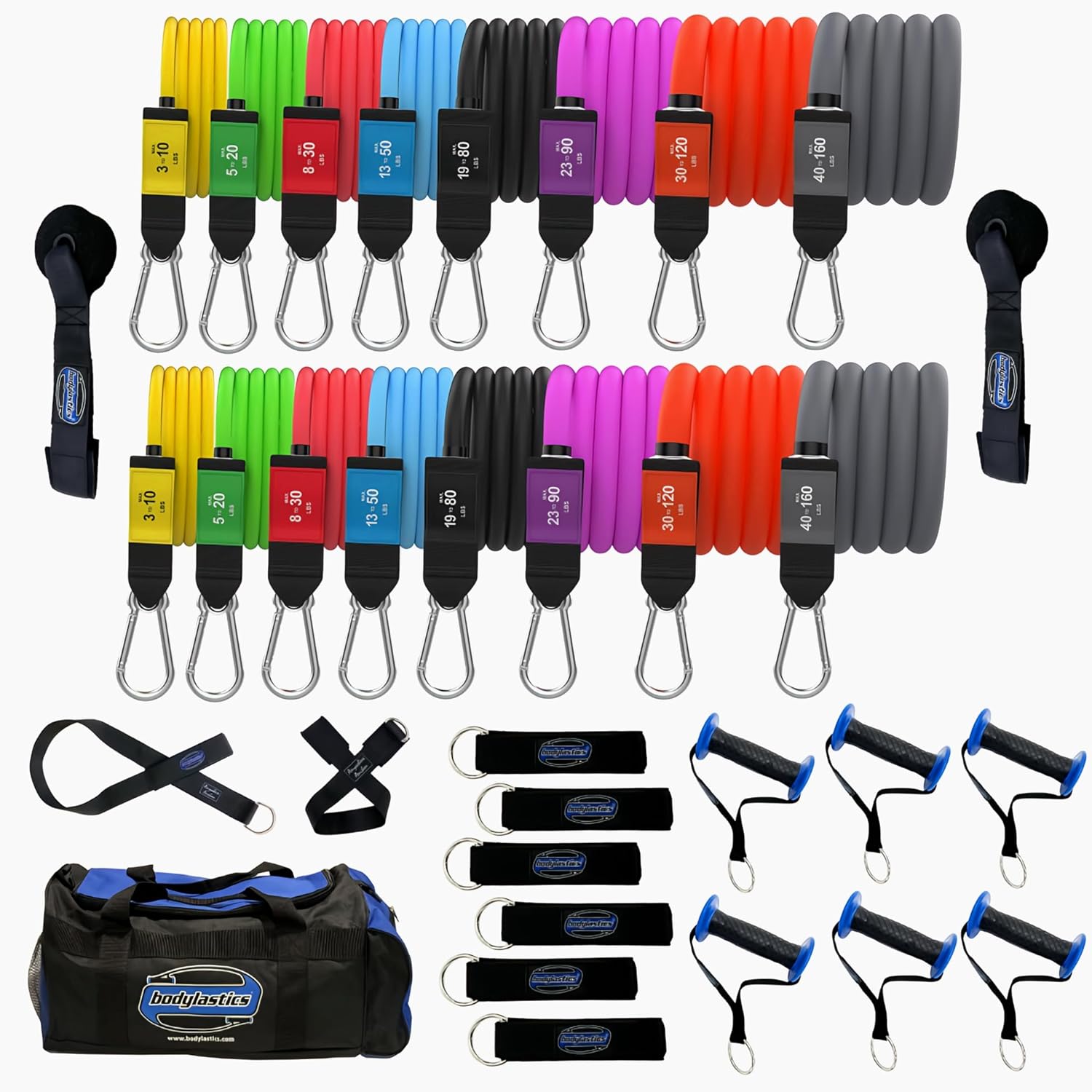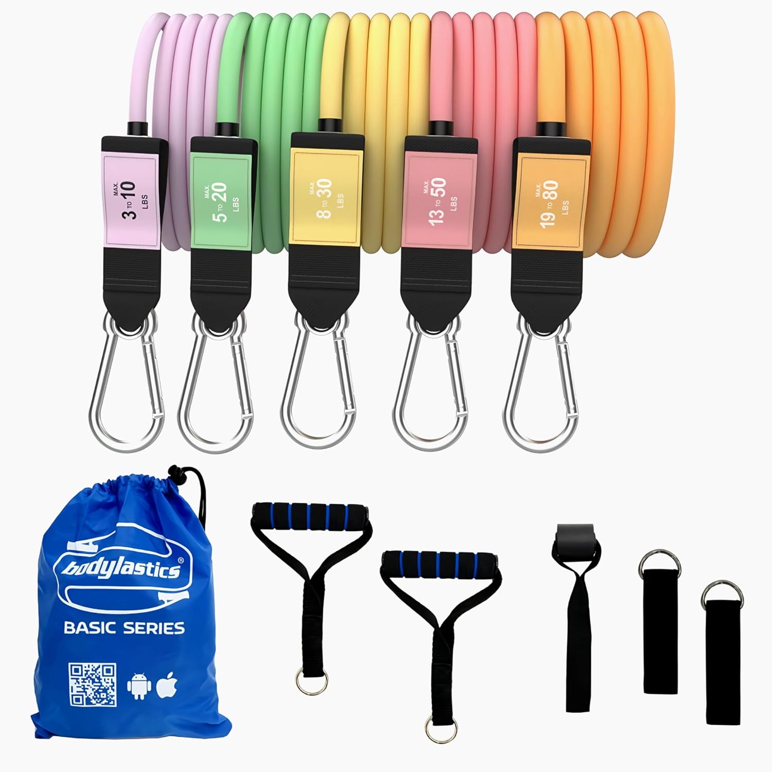 Bodylastics Patented Basic Series Resistance Band Set - 5 Resistance Bands (46 Inch each vs PRO Series 54 Inch) , 2 Handles, 2 Ankle Straps, 1 Door Anchor, Carry Bag - Snap Reduction Tech