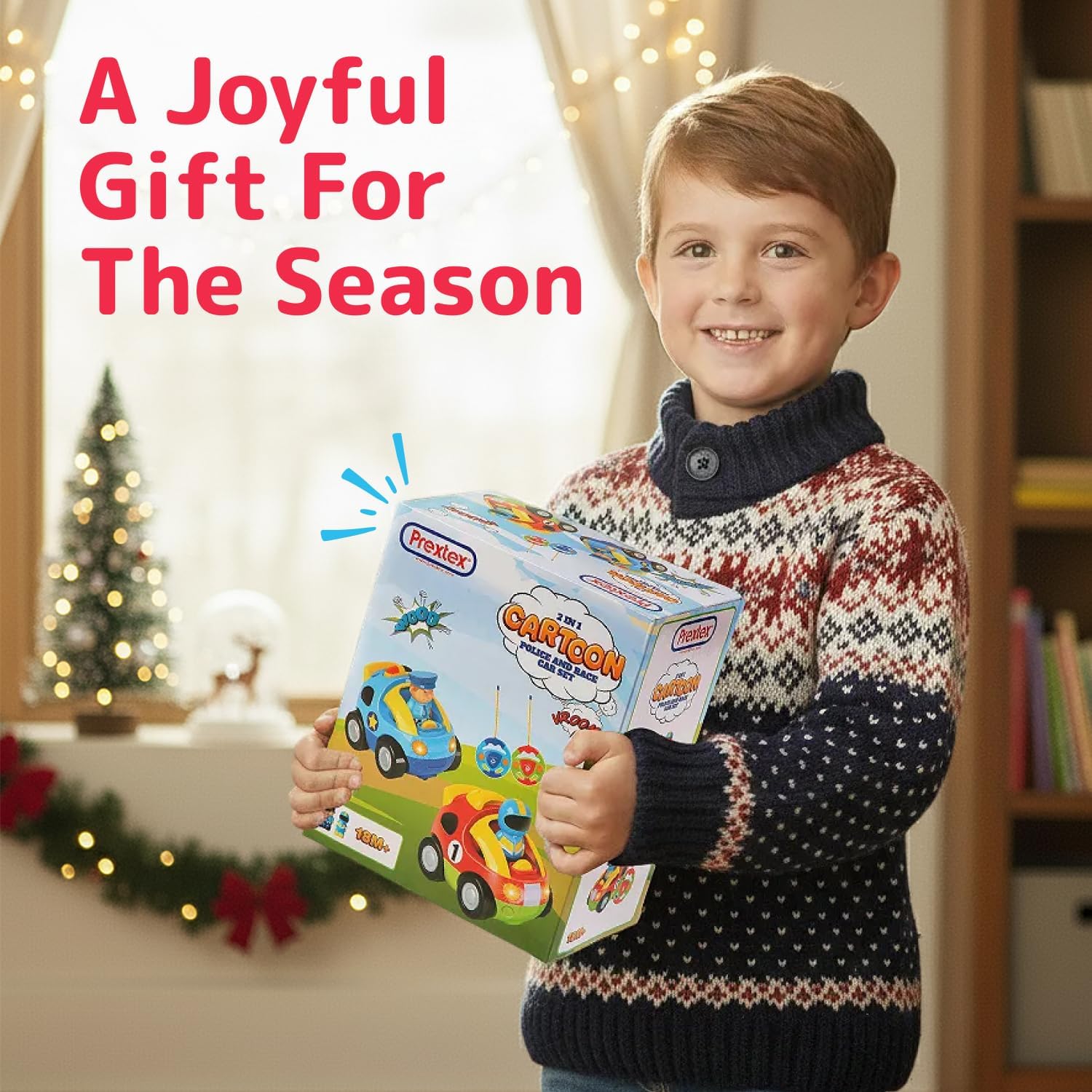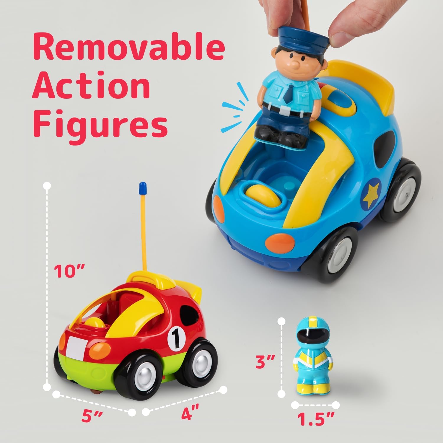 Prextex 2 Pack Cartoon Remote Control Cars for Toddlers - Police Car and Race Car with Steering Wheel Controllers and Lights - Different Frequencies So Both Can Race Together - Toddler Gift 18+ Months