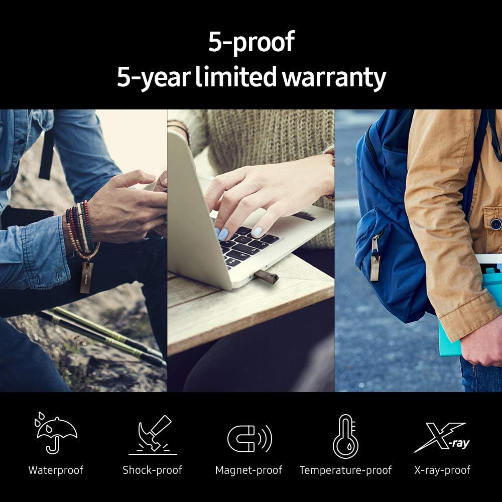 Redefine everyday file transfers with the Samsung BAR Plus USB 3.1 Flash Drive. Just plug it in and expand the storage of your devices with an unnoticeable, seamless fit. Designed with a key ring to prevent loss. Fast and convenient read speeds up to 300MB/s*, so that you have more time to work, play, watch, and create. A reliable and secure solution for your personal photos, videos, music, documents, and files. shock proof, magnet proof, temperature proof, x-ray proof). Experience Samsung's industry-leading V-NAND (64 layer) technology. *Speeds may vary by capacity.Operating Temperature :0~60℃.
