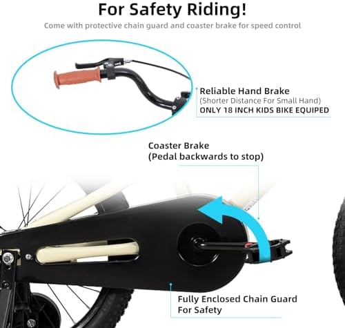 DESIGN FOR KIDS - 1. This Kids bike comes with stable training wheel early rider. 2.Quick release seat simplify the height adjustment. 3.Saddle with holder to learn riding when the training wheel is off. 4.Foot brake suitable for young rider don't have enough power to manipulate the hand brake. MINIMUM MAINTENANCE - Made of premium steel to survive the bumps of learning, the durable steel frame is backed by our limited lifetime warranty. The bike comes with black tire & single speed, only little maintenance needed due to the simple design. DIY DECAL & SAFE CHAIN GURAD - Your child will get a DIY decal, they could make a unique bike with the decal by sticking their name on the frame or chain guard. The chain guard well protects the chain, it will last longer than other bikes, your child will not get hurt when try to touch the chain. EASY TO INSTALL - The children bike comes with 85% Pre-assembled body and the basic assembly tools, only pump needed for tire, normally takes a novice about 20 minutes to assemble it. If you have problem about assembly or the bike, please contact us. RECOMMENDED SIZE CHART - 12" BIKE FOR 2-4 YEARS (33"-41") TODDLER, 14" bike for 3-5 years (35" - 47") child, 16" bike for 4-7 years (41" - 53") boys & girls, 18" bike for 5-9 years (43"-59") boys & girls. Note: child height may vary even at the same age, please take the height into consideration.