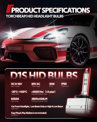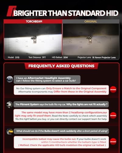 Safer Night Driving: Torchbeam d1s bulbs made with German xenon gas, 300% much brighter than halogen bulbs. Replacement OEM Part Number: 66140, 66140CBI, 66144, 66144CBI, 85415C1, 85415WX, 85415XV, 85410C1, 85410WX, ect. Simpler Installation: Factory specification design, no dashboard error, the replacement will be completed in a few minutes at home. **Tips for BMW chassis codes,fit E90/E91/E92/E93,F07/F10/F20/F21/F30/F31/F34/F80 and E60/E61 since year 2006 Note: Most car models have more than two assemblies. D1S HID bulb usually uses a lens assembly, the bulb reaches its brightest level after a few seconds of lighting. Please confirm your car is HID assembly to avoid unable installation. 6000K, diamond bright white, it can illuminate the roadside signs more clearly than 4300K. Extend Lifespan: 35W low power consumption, anti-ultraviolet coating can prevent the brightness of the bulb from dimming continuously. ONLY for replacement of your stock D1S/DS1 bulb, not for Halogen bulb EVEN IF it shows "Fit" Reduce Replacements Frequency: Equipped with shock-proof aluminum shell base, our xenon hid headlights can resist the damage caused by rain, snow and dust intrusion or high temperature inside the engine cover with IP 67 waterproof.