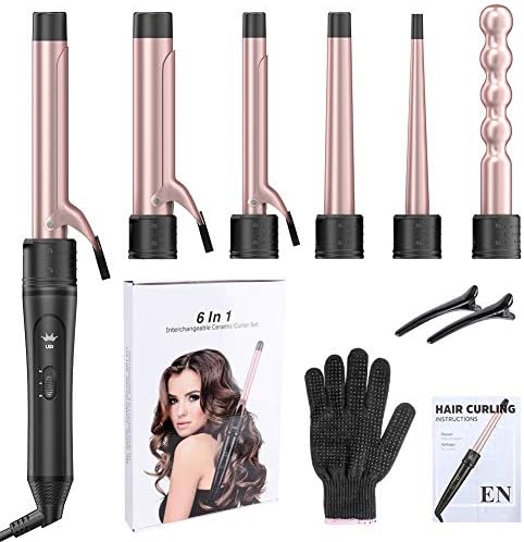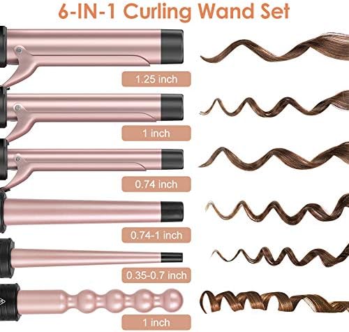 6-in-1 Curling Iron, Professional Instant Heat Up Hair Curling Wand Set with 6 Interchangeable Ceramic Barrels (0.35'' to 1.25'') and 2 Temperature Adjustments, Heat Protective Glove & 2 Clips