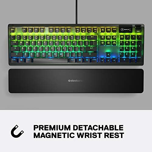 Hybrid blue mechanical gaming switches – The tactile click of a blue mechanical switch plus a smooth membrane – guaranteed for 20 million keypresses OLED smart display – Customize with gifs, game info, discord messages, and more. Aircraft-grade aluminum alloy frame – Manufactured for unbreakable durability and sturdiness Dynamic per-key RGB illumination – Gorgeous color schemes and reactive effects for every key Premium magnetic wrist rest – Provides full palm support and comfort 900 x 300 x 4 millimeter / 35.43 inches x 11.81 inches