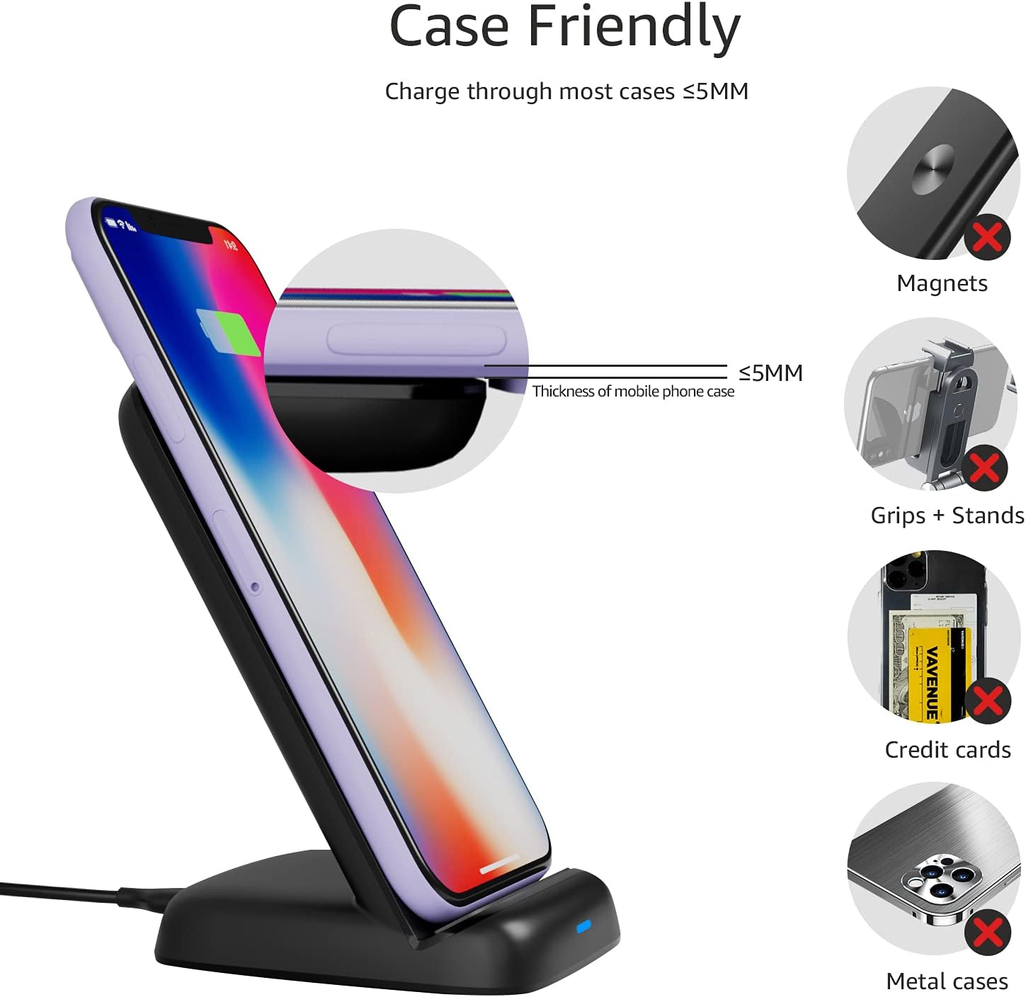 Case Friendly: Transmits power through most protective cases (rubber/plastic/TPU cases under 5mm thickness ONLY). For faster charging with iPhone remove all cases before charging. Avoid charging with magnetic and metal cases or credit cards on; these cases will prevent operation