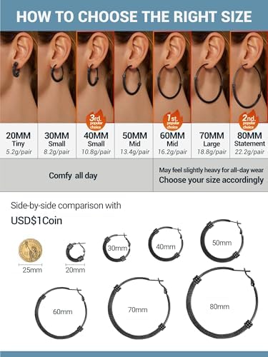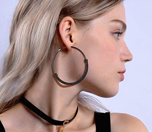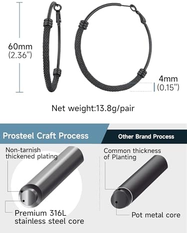 Material: 316L Stainless Steel with Black Gun Plated, Solid, Highly Resisted to Rust or Tarnish. Hypoallergenic, Suitable for Sensitive Skin. Size: 60mm*60mm, weight: 13.8g/pair, these chunky Hoop Earrings are everything your wardrobe needs now. An easy, classic accessory that will pair endlessly with your favorite styles. Always On Trend. These simple thick hoops will liven up your clothes without detracting from its simplicity. Not Seasonal. Simple but Elegant. Easy Match. Beautiful hoop earrings that can be worn with anything. Great for everyday wearing. The hoop earrings will come with box and black velvet pouch.