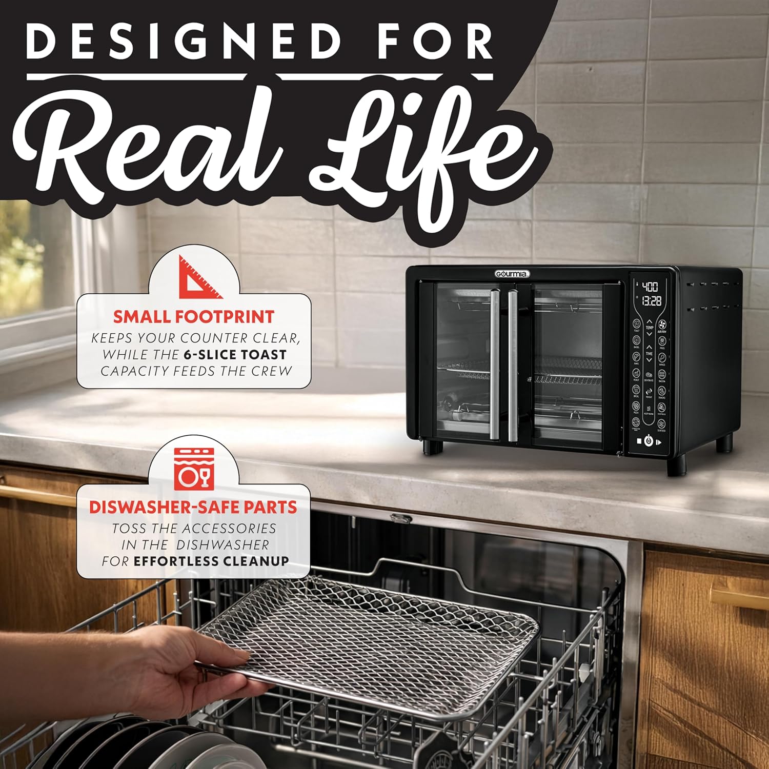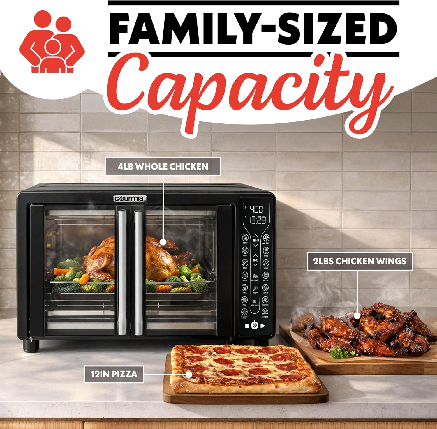- Spacious French Door Design – Dual doors open with one hand for easy loading of family-size meals, its 25 quart capacity fits a 12-inch pizza, 6 slices of toast, or a whole chicken
