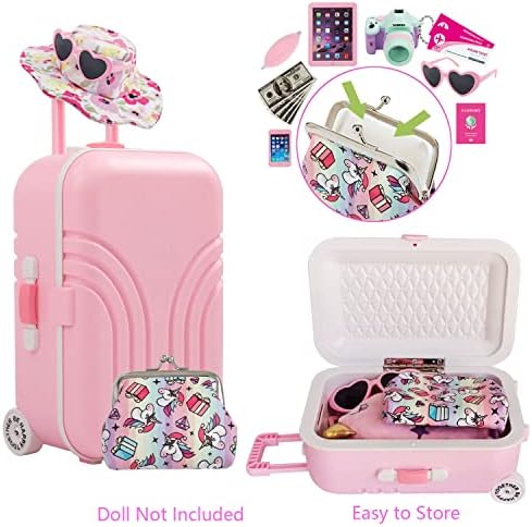 18 Inch Doll Suitcase Travel Luggage Play Accessories, Doll Clothes Accessories Carrier Storage Set, Case, Hat, Sunglasses, Camera, Pillow, Toy Pet