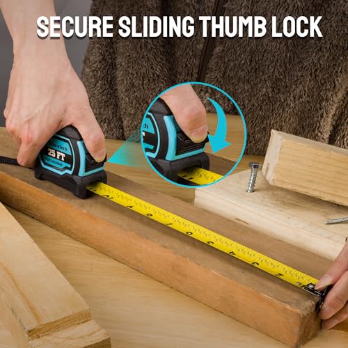 EXCELLENT MATERIAL: The engineer tape measure is made of high quality thickened carbon steel and wrapped with nylon coated for maximum durability. It's stiff enough to feed out 7 ft easily without bending. The shell is made of ABS high hardness plastic and TPR elastic rubber, which is wear-resistant and drop-proof. MAGNETIC HOOK : The end of the measuring ruler tape is outfitted with powerful magnets. Those magnets are strong enough to grip any metal surface effortlessly. The fractional double-sided tape measure makes it easier to take single-person measurements even over long distances. LOCKING MECHANISM : Secure sliding Thumb lock makes locking a natural movement. The retractable tape measure slides up and down to releases and locks with ease , which is a style of locking that very reliable. ZERO POINT CORRECTION HOOK : Sliding hooks are used for precise inside and outside measurement, so measurement uncertainty can be tightly controlled. The magnetic claw can move back itself to deduct its own thickness when conducting inside measurement. MAKE MEASURING EASY : The easy read tape measure with metal buckle design and portable hanging lanyard is perfect for indoor and outdoor measurements. 1" blade width, easy to read 1/8 inch fractional marks, feet marks,triangle markings every 19.2" make DURATECH tape measure a perfect tool for engineer, builders, carpenters and more.