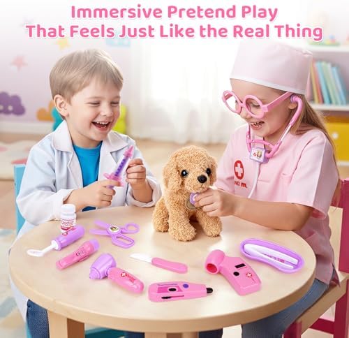 Meland Toy Doctor Kit for Girls, Pretend Play Toy Doctor Set with Dog , Carrying Bag, Stethoscope & Dress Up Costume Gift for Kids Toddlers Ages 3 4 5 6 Year Old for Role Play