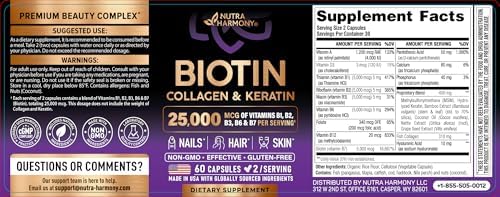 NUTRAHARMONY Biotin | Collagen | Hyaluronic Acid | Keratin - Support Normal Hair Growth Cycle - Skin & Nails - 25000mcg Vitamins B1, B2, B3, B6 & B7 - for Women & Men - Made in USA | 60 Capsules