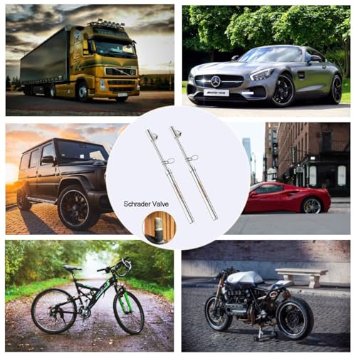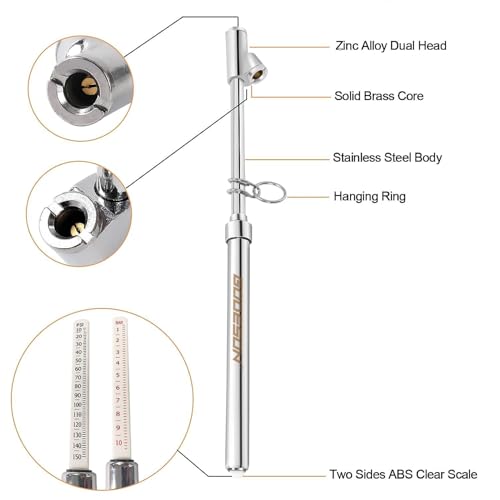 1. LONG ZINC ALLOY DUAL HEAD DESIGN : Straight foot air chuck are deisghed for inner wheels or difficult reached valve as well as the 30°reverse chuck are for outer wheels.A good choice for testing your tire pressure 2.ACCURATELY MEASURE THE TIRE PRESSURE:Two-side ABS bar calibrated:10-150 psi / 1-10Bar; 2 psi increment,Easy read printed clear scale .Perfect for truck, car, suv, rv, atv, bike or motorcycle with schrader valve 3.HEAVY DUTY WELL BULIT STRUCTURE:Zinc alloy chuck with solid brass core, chrome -plated steel body with a hanging ring for easy storage.No battery needed, suitable for any severe environment 4.HOW TO USE: Push the chuck on the tire valve to get the air out of the tire, the scale bar will slip out and then you can get the pressure reading.Once finished the adjustment of the tire pressure, don't forget to screw on the valve caps 5.UNIVERSAL FIT CAR TRUCK Protect your vehicle, Extend useful life of tyre, Save your FUEL cost, Enhance your driving ability , Keep you and your family safe Get One For You And Your Family!