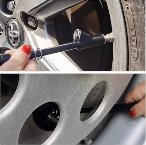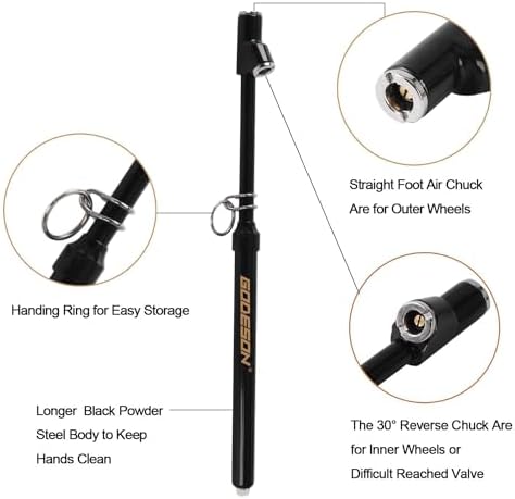 1. LONG ZINC ALLOY DUAL HEAD DESIGN : Straight foot air chuck are deisghed for inner wheels or difficult reached valve as well as the 30°reverse chuck are for outer wheels.A good choice for testing your tire pressure 2.ACCURATELY MEASURE THE TIRE PRESSURE:Two-side ABS bar calibrated:10-150 psi / 2 psi increment,Easy read printed clear scale .Perfect for truck, car, suv, rv, atv, bike or motorcycle with schrader valve 3.HEAVY DUTY WELL BULIT STRUCTURE:Zinc alloy chuck with solid brass core,stainless steel body,black powder coating with a hanging ring for easy storage.No battery needed, suitable for any severe environment 4.HOW TO USE: Push the chuck on the tire valve to get the air out of the tire, the scale bar will slip out and then you can get the pressure reading.Once finished the adjustment of the tire pressure, don't forget to screw on the valve caps 5.UNIVERSAL FIT CAR TRUCK Protect your vehicle, Extend useful life of tyre, Save your FUEL cost, Enhance your driving ability , Keep you and your family safe Get One For You And Your Family!