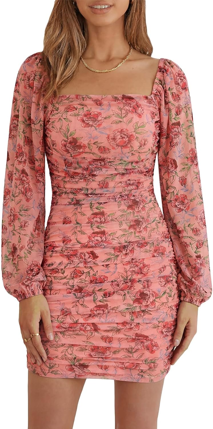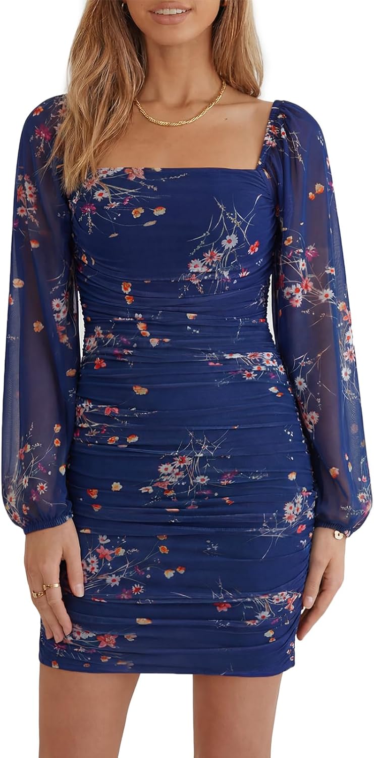 Wenrine Women's Mesh Long Sleeve Square Neck Ruched Party Club Cocktail Bodycon Mini Dress