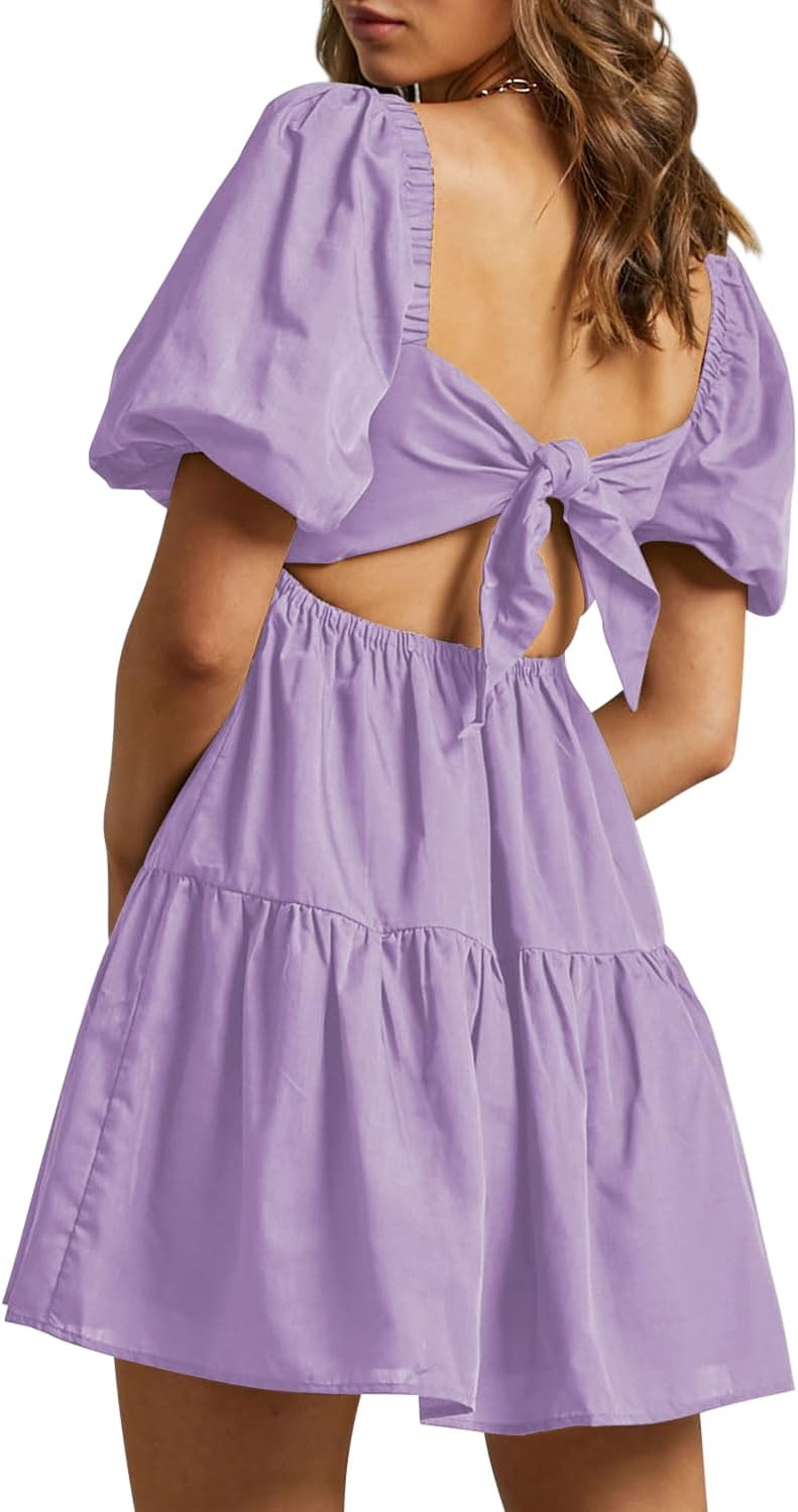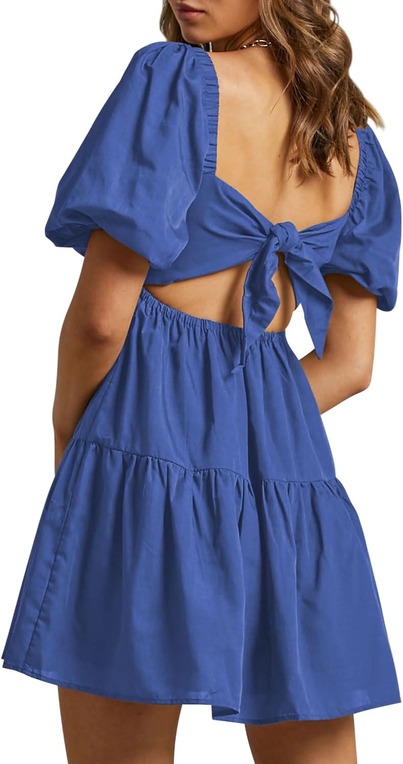 OWNGIGI Women's Summer Dress Square Neck Puffy Short Sleeve Loose Tie Back Casual A-Line Mini Dresses