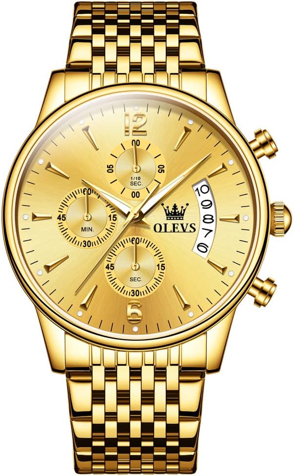 OLEVS Men's Stainless Steel Chronograph Watch, Big Face Gold Silver Black Tone Easy to Read Analog Quartz Watch, Luxury Waterproof Date Diamond Roman Arabic Numerals Dial Dress Watch for Men