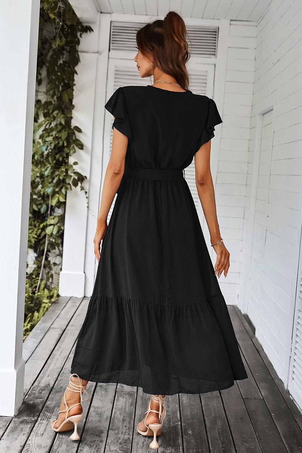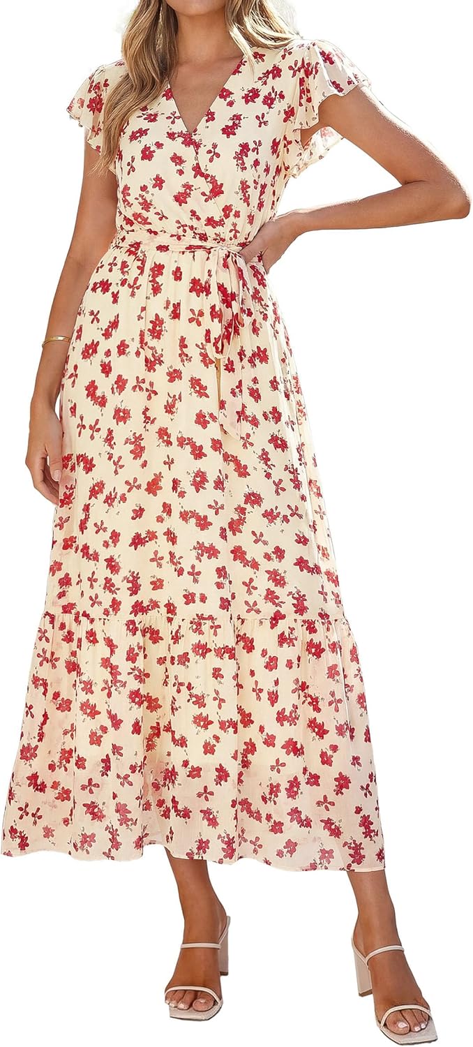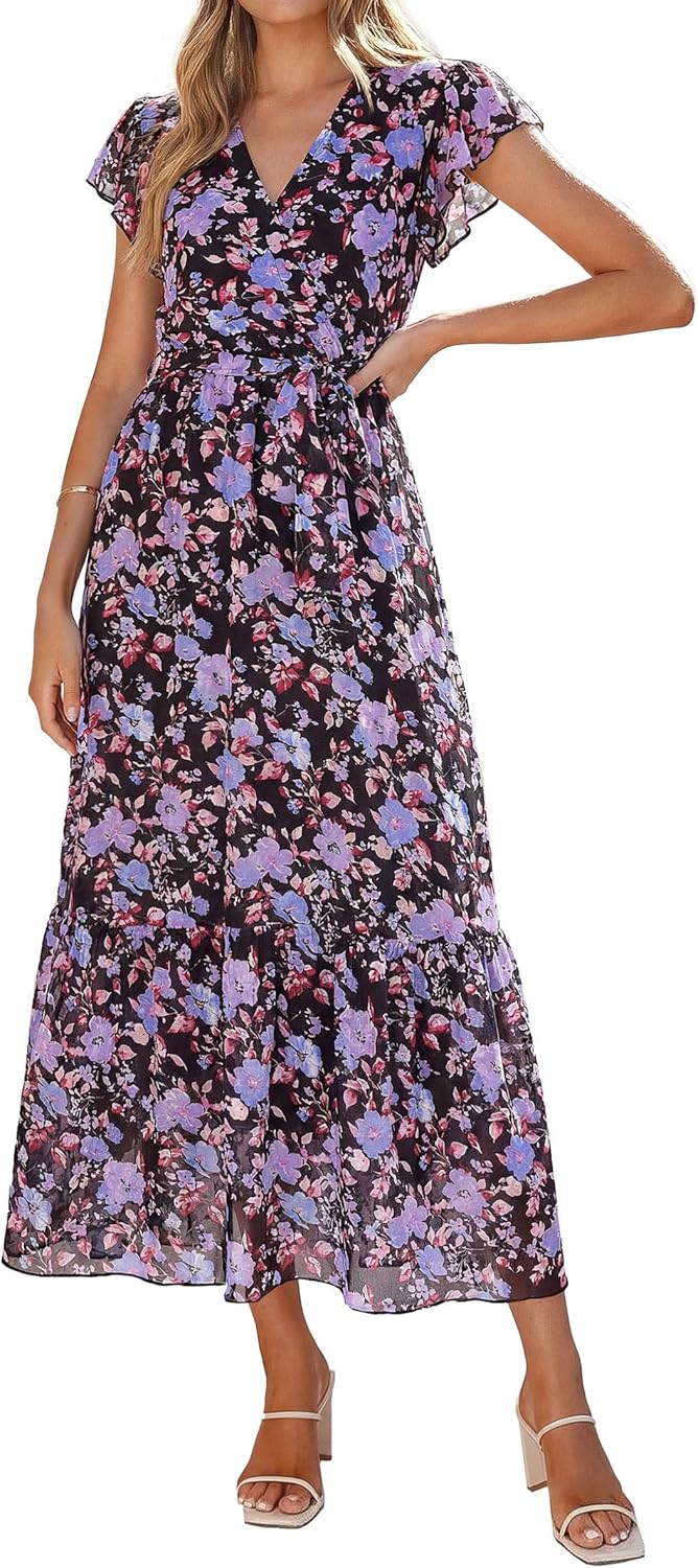 PRETTYGARDEN Women's Summer Floral Boho Maxi Dress Short Sleeve Wrap V Neck Ruffle Long Flowy Beach Wedding Guest Dresses