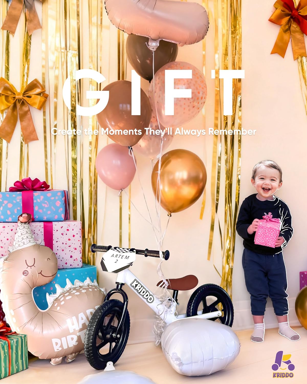 KRIDDO Toddler Balance Bike 2 Year Old, Age 24 Months to 5 Years Old, 12 Inch Push Bicycle with Customize Plate (3 Sets of Stickers Included), Gift Bike for 2-3 Boys Girls, White