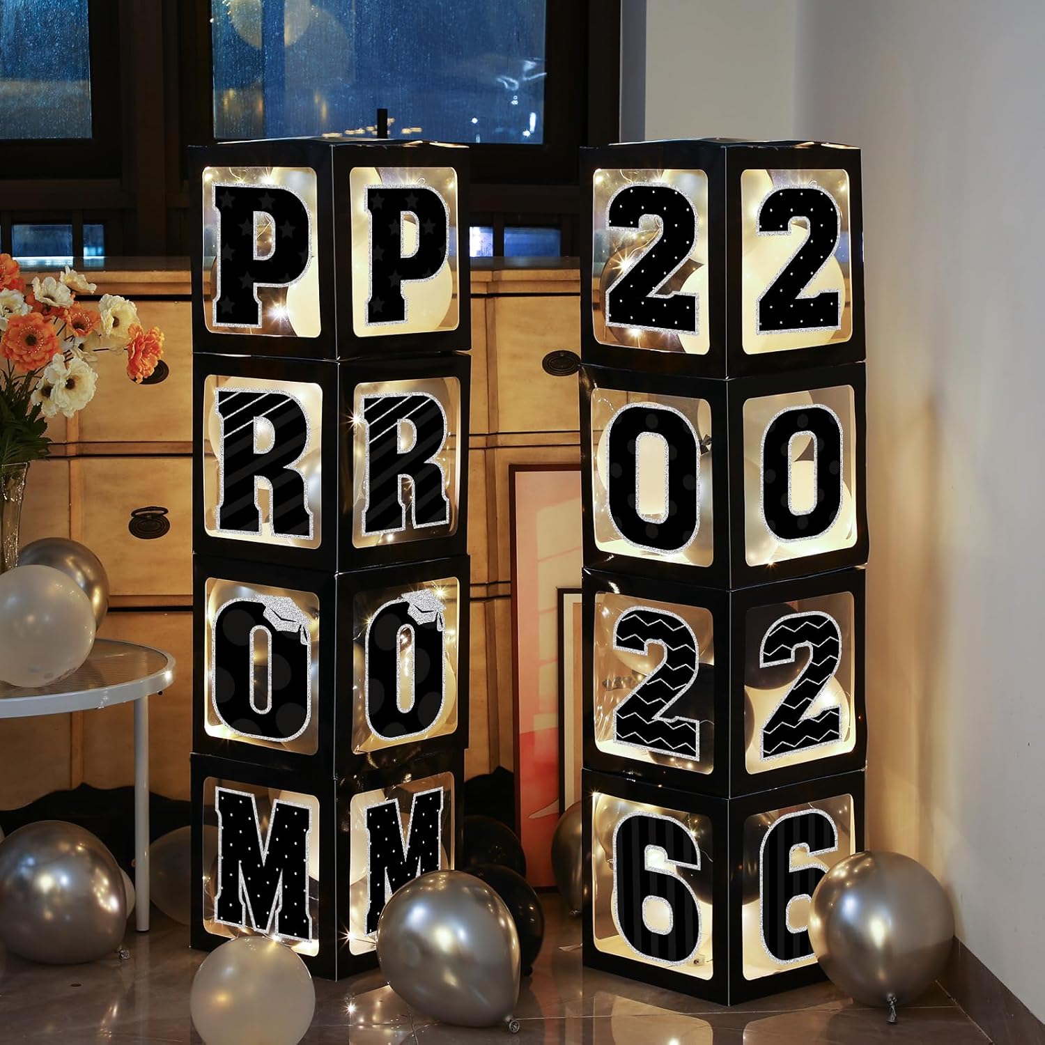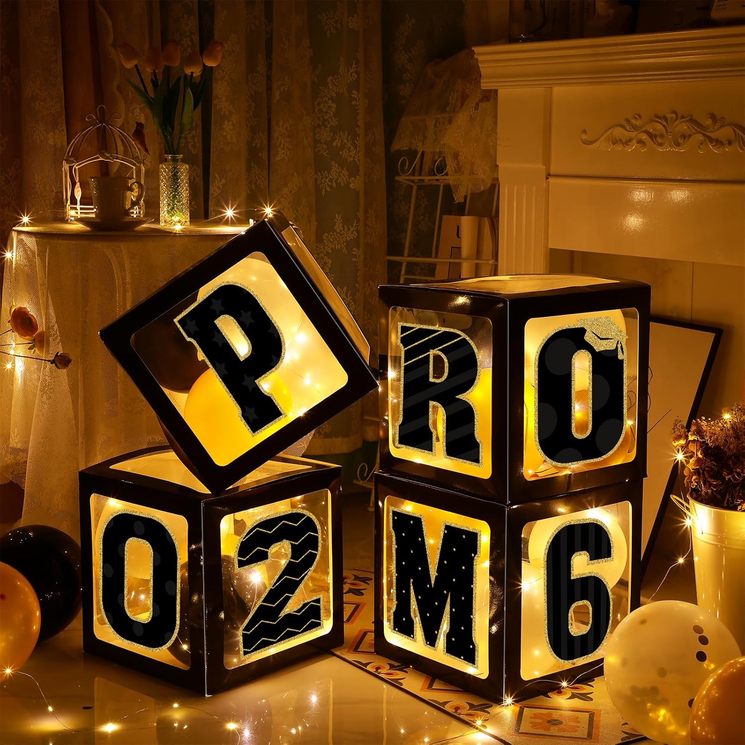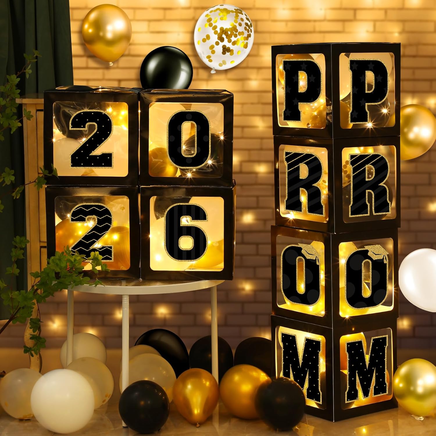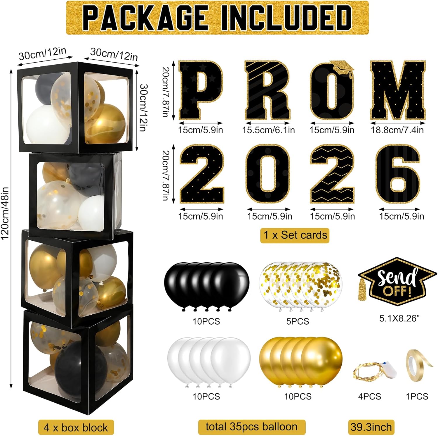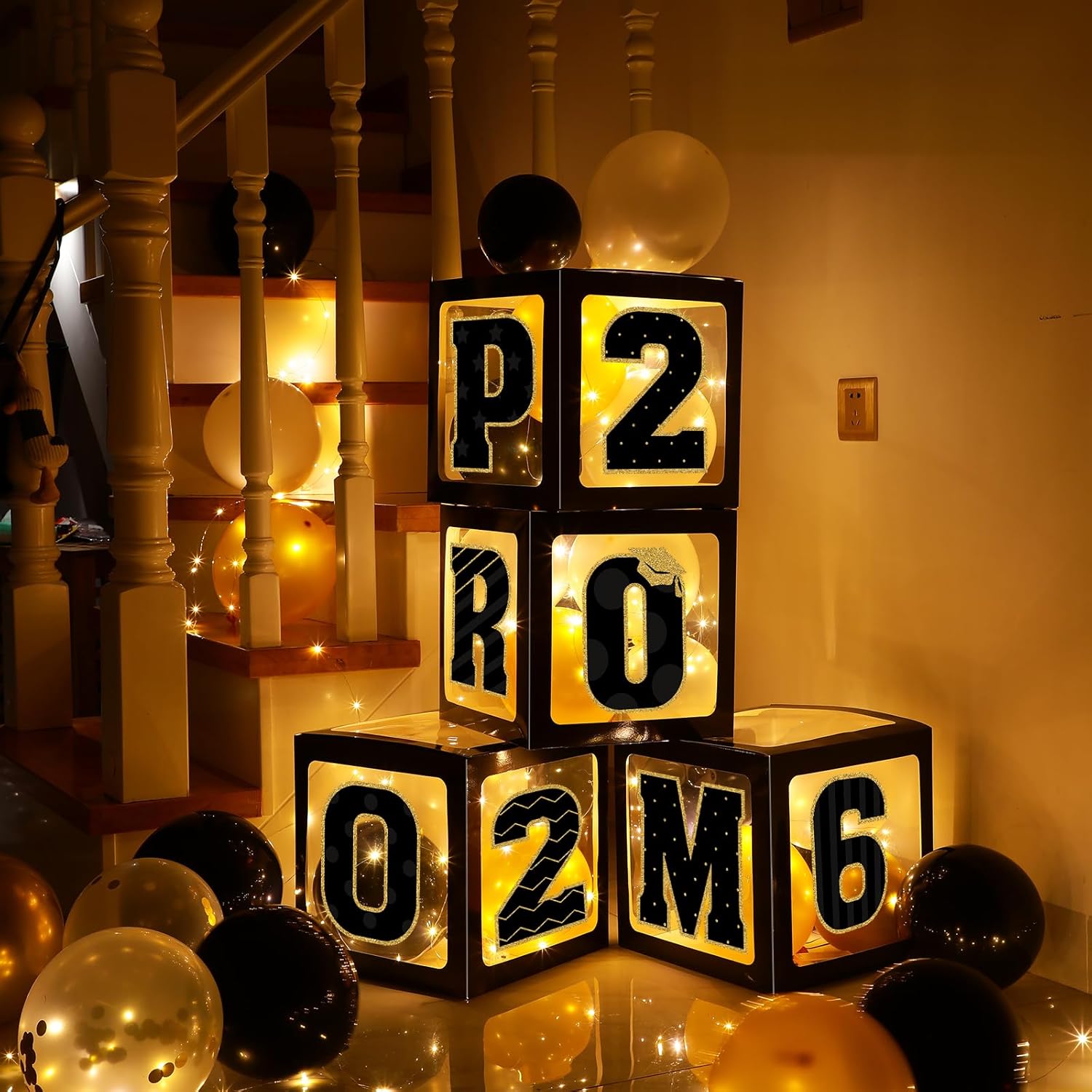 Graduation Prom Party Decorations Class of 2026, 4 Pcs Black and Gold Balloon Boxes with Letters and Light Strings, Graduation Prom Party Supplies Decor for College High School Congrats Grad Ceremony