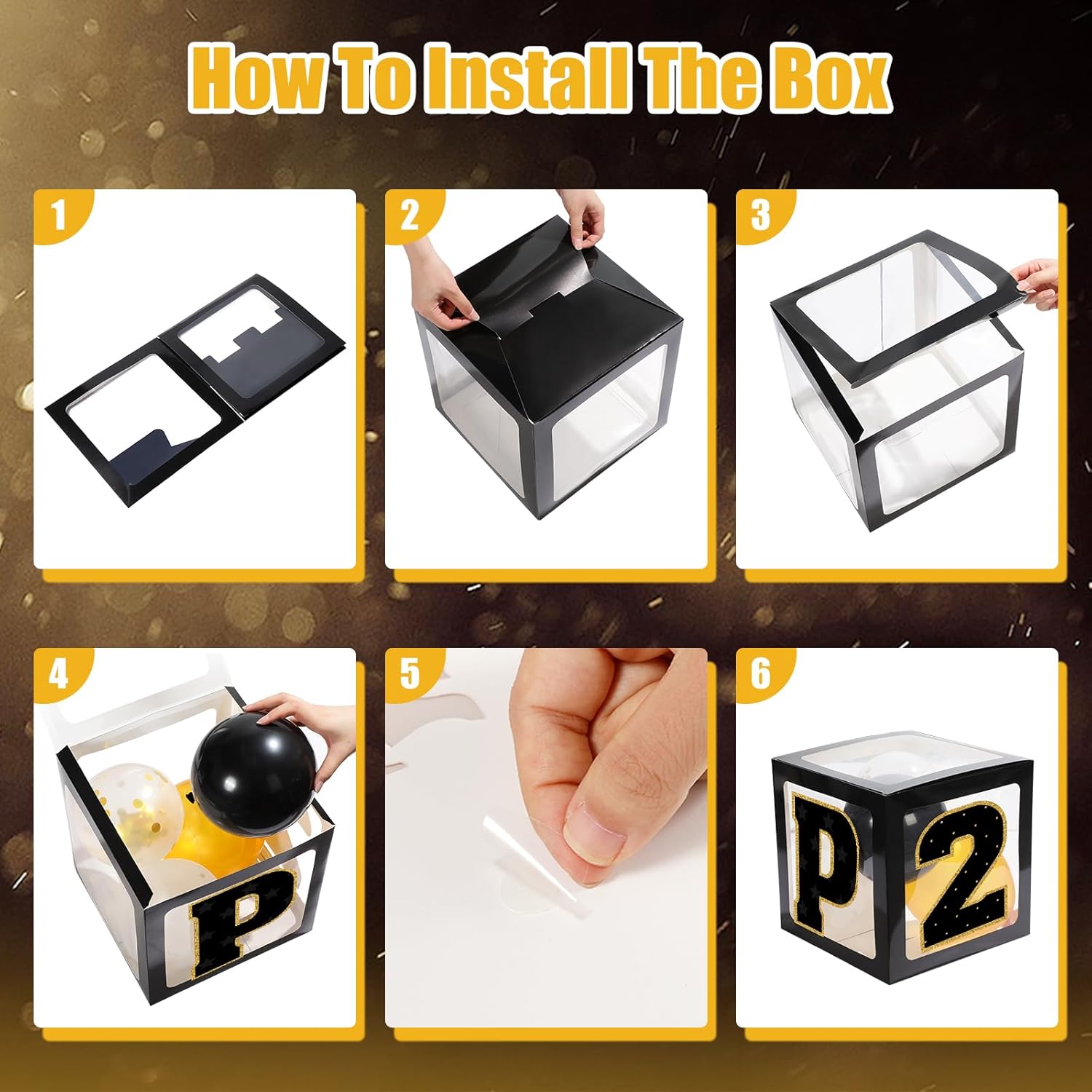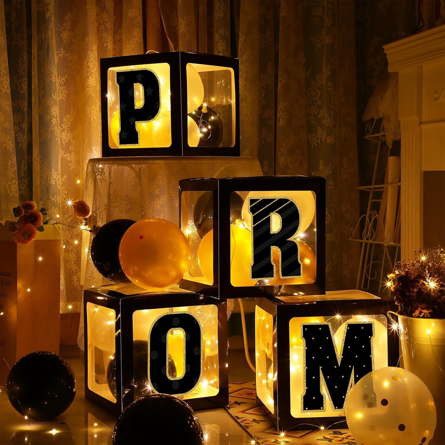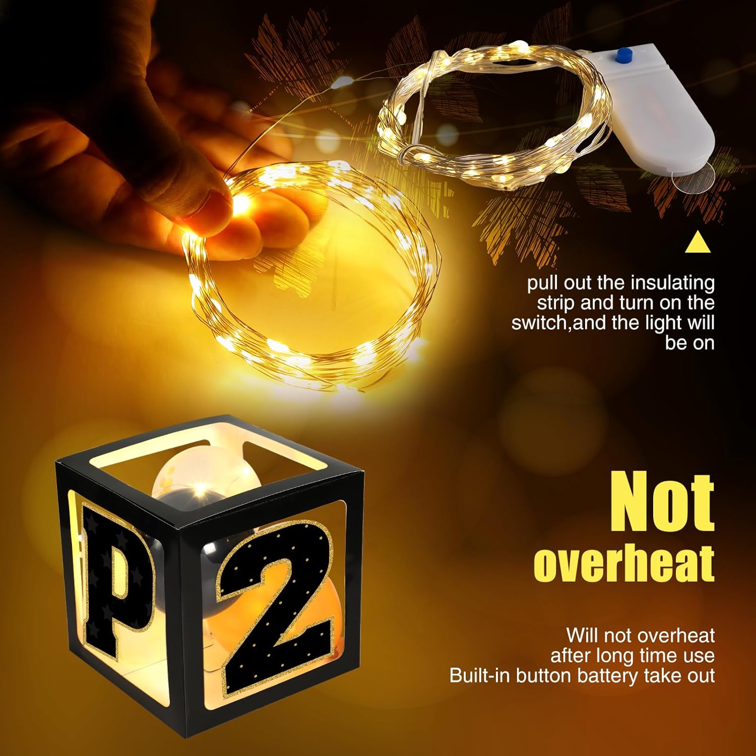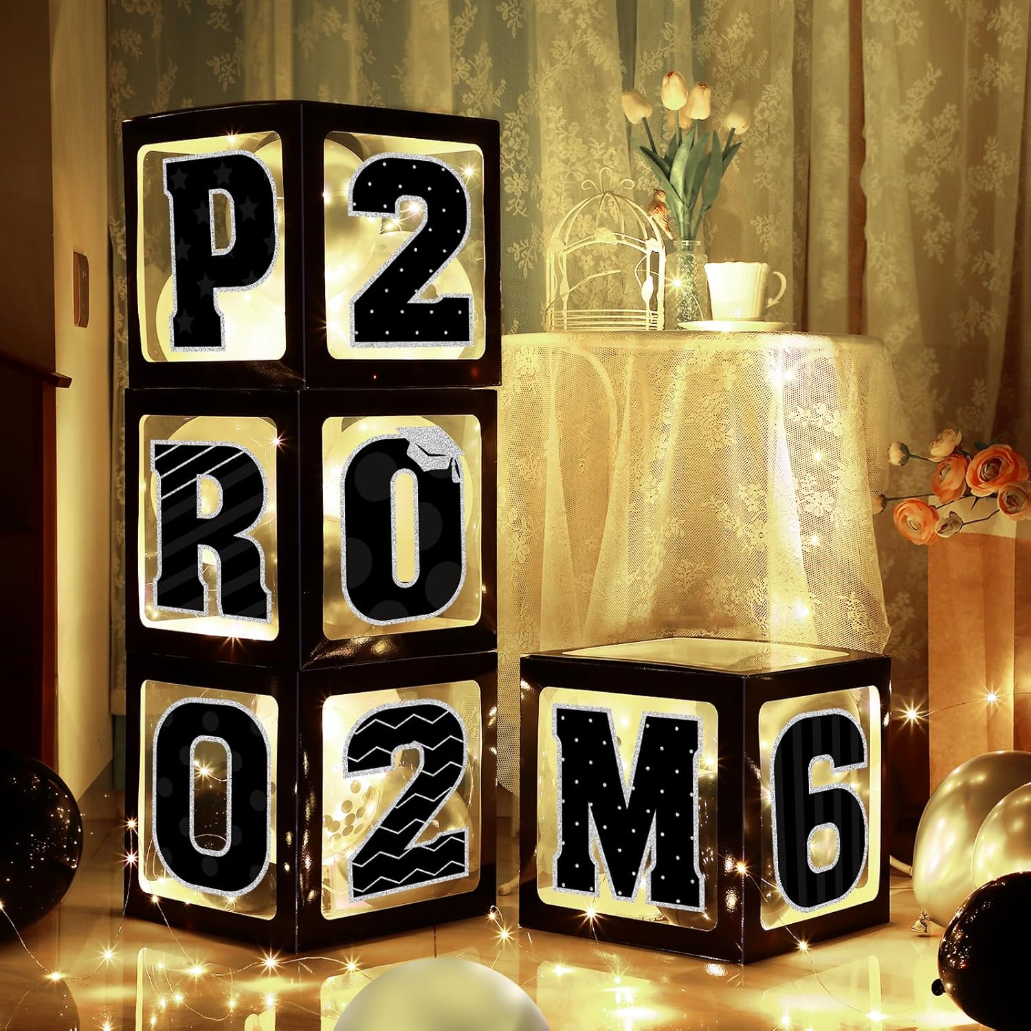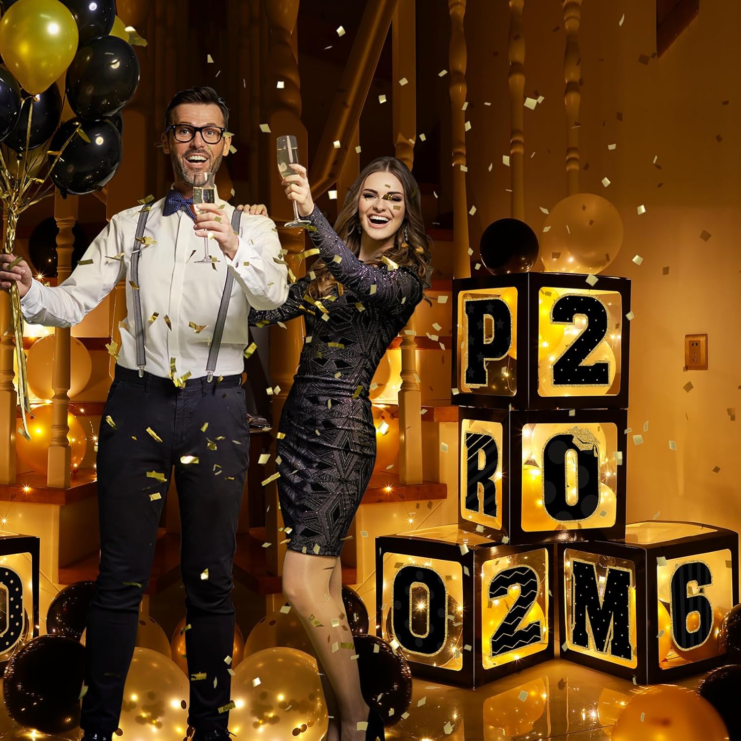 Graduation Prom Party Decorations Class of 2026, 4 Pcs Black and Gold Balloon Boxes with Letters and Light Strings, Graduation Prom Party Supplies Decor for College High School Congrats Grad Ceremony