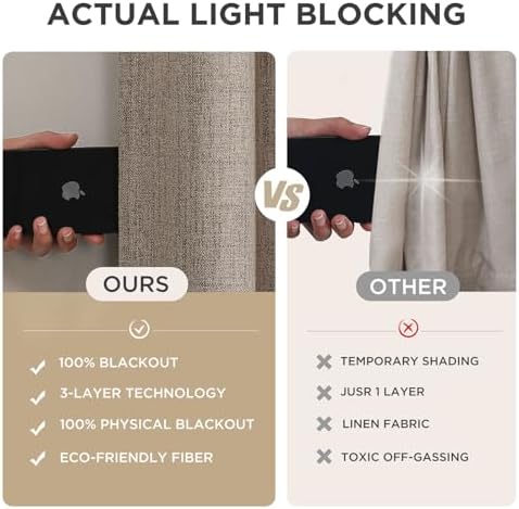 Polyster 100% Total Blackout & UV Blocking: Achieve perfect darkness with these blackout curtains! The dedicated liner blocks 100% sunlight and UV rays, ideal for any bedroom or living room. This blackout curtain protects furniture from fading and helps regulate room temperature year-round. Dual Hanging Options Rod Pocket & Back Tabs: Enjoy versatile styling for your curtains. This set offers both a classic rod pocket and modern back tabs for a tailored look. Easily install this curtain panel pair on any standard rod, making them perfect curtains for bedroom or living room curtains. Premium Textured Fabric & Privacy: Elevate your space with the luxurious look of linen curtains. Our heavyweight faux linen fabric provides exceptional durability, a soft drape, and enhanced noise reduction. These curtains ensure ultimate privacy and a calm atmosphere. Energy-Saving Thermal Insulation: The dense weave of these thermal blackout curtains acts as an insulating barrier, trapping air to keep heat or cold out. This makes them energy-efficient bedroom curtains or curtains for living room in any climate. Complete Set & Easy Care: This ready-to-hang set includes two blackout curtain panels. Each curtain panel measures 52" W x 84" L, Full pair spans 104" width—perfect for standard 48-100" windows. Providing full coverage for most windows. These machine-washable drapes are the effortless solution for your bedroom or living room.