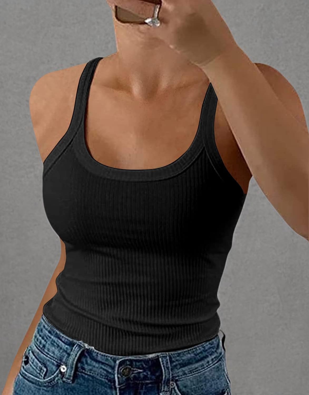 GEMBERA Women Spaghetti Strap Scoop Neck Ribbed Tank Tops Slim Fitted Cotton Camisole Basic Sleeveless Layering Shirts
