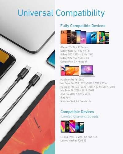 The Anker Advantage: Join the 80 million+ powered by our leading technology. Rapid Charging: Supports high-speed charging up to 100W when used with a compatible charger. Highly Compatible: Designed to work flawlessly with any USB-C device. Rugged and Durable: A hard-wearing nylon exterior combines with a 5,000-bend lifespan to create a cable that’s durable both inside and out. What You Get: New Nylon USB-C to USB-C 100W Cable (10 ft, 2pack), hook and loop cable tie, welcome guide, 18-month warranty, and friendly customer service. Note: This is a data transfer and charging cable, and does not support video output.