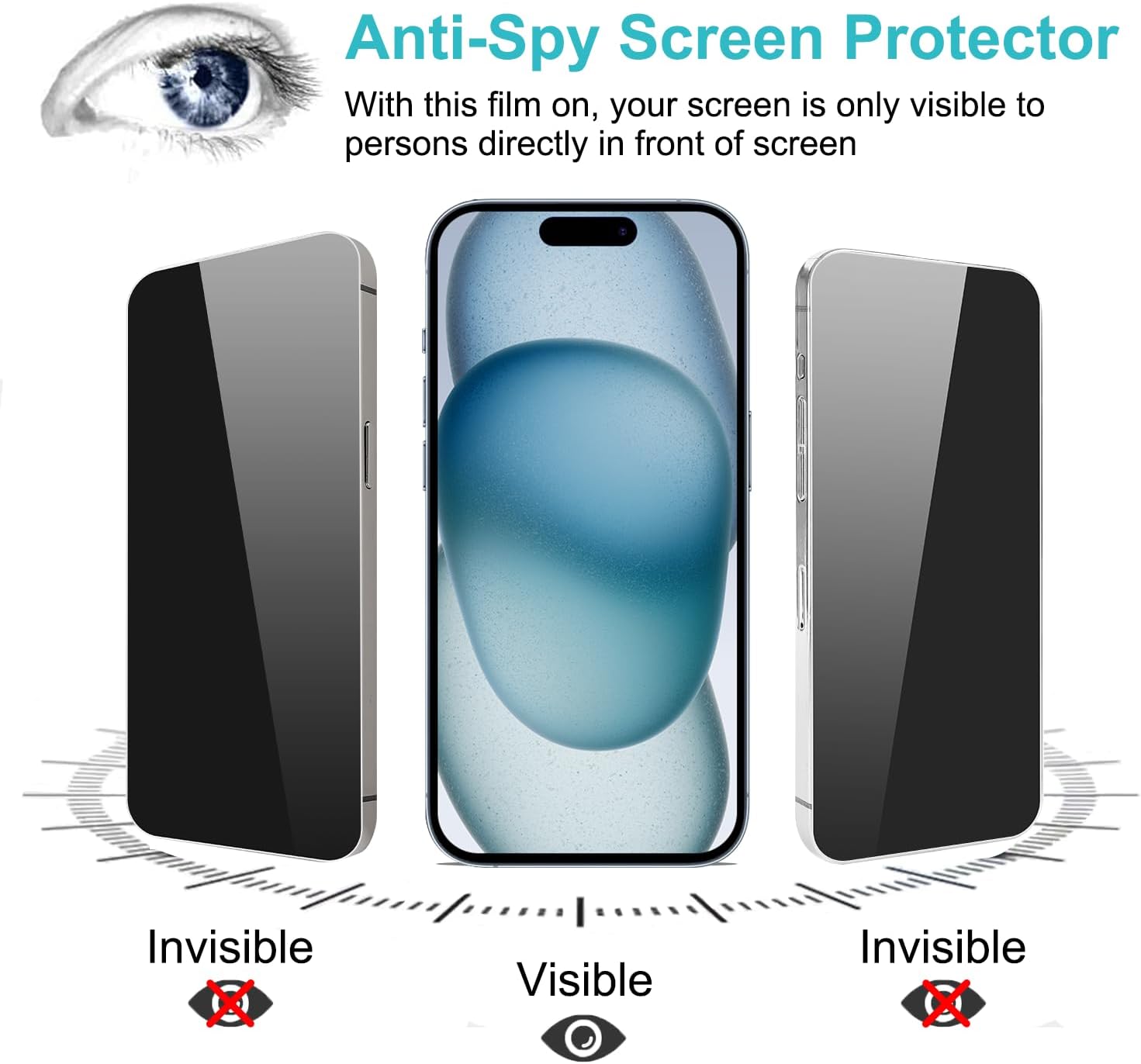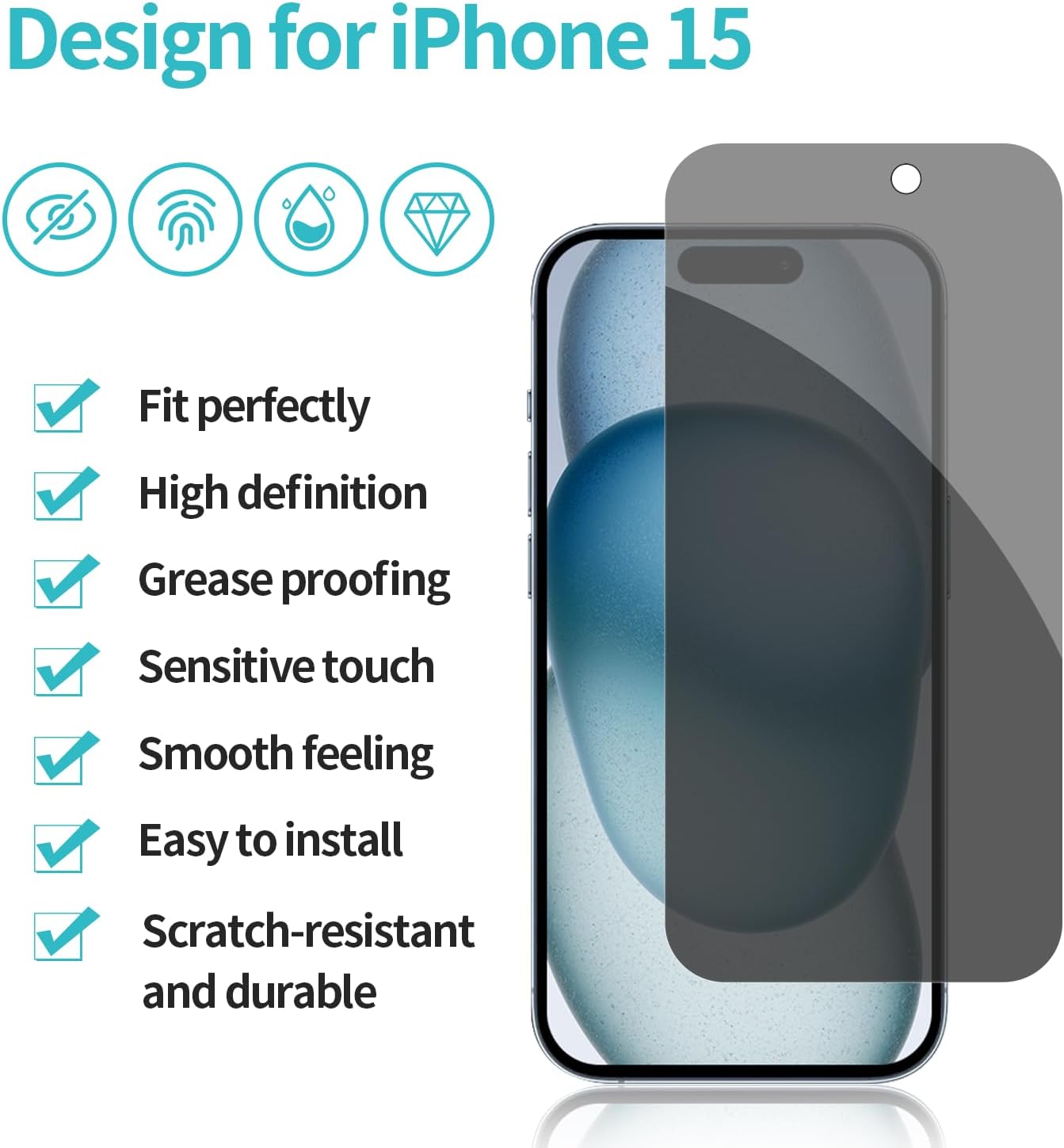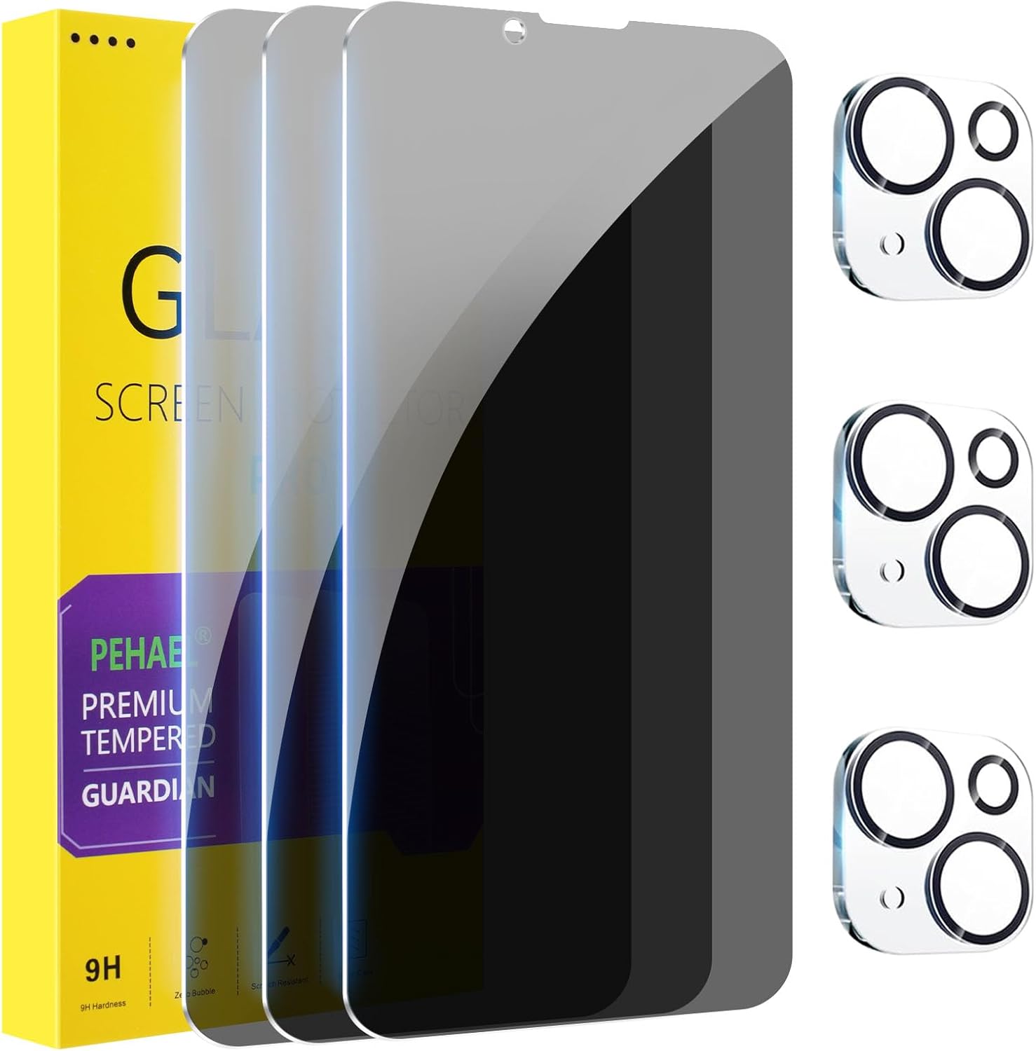 PEHAEL 2+2 Pack for iPhone 15 Privacy Screen Protector with Camera Lens Protector Full Coverage Anti-Spy Tempered Glass Film 9H Hardness Easy Installation Bubble Free [6.1 inch]