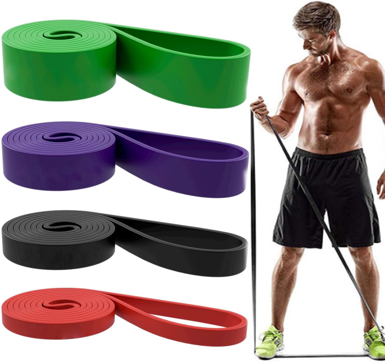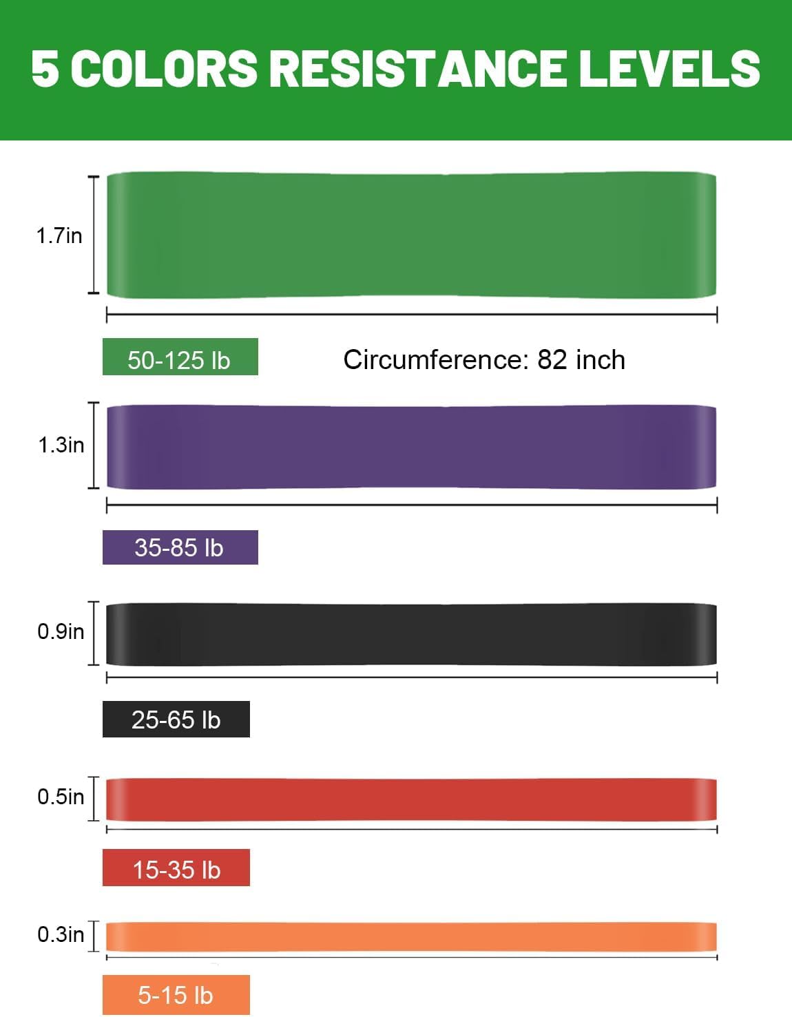 Package Included: 5 pull up bands, 1 carrying bag and 1 workout guide. Resistance bands are 5-15 lbs,15-35 lbs, 25-65 lbs, 35-85 lbs, 50-125 lbs. Use these exercise bands to perform rows, pulls, raises, and fly workout sets to exercise your arms, back, hips, legs, chest, and abdominal region