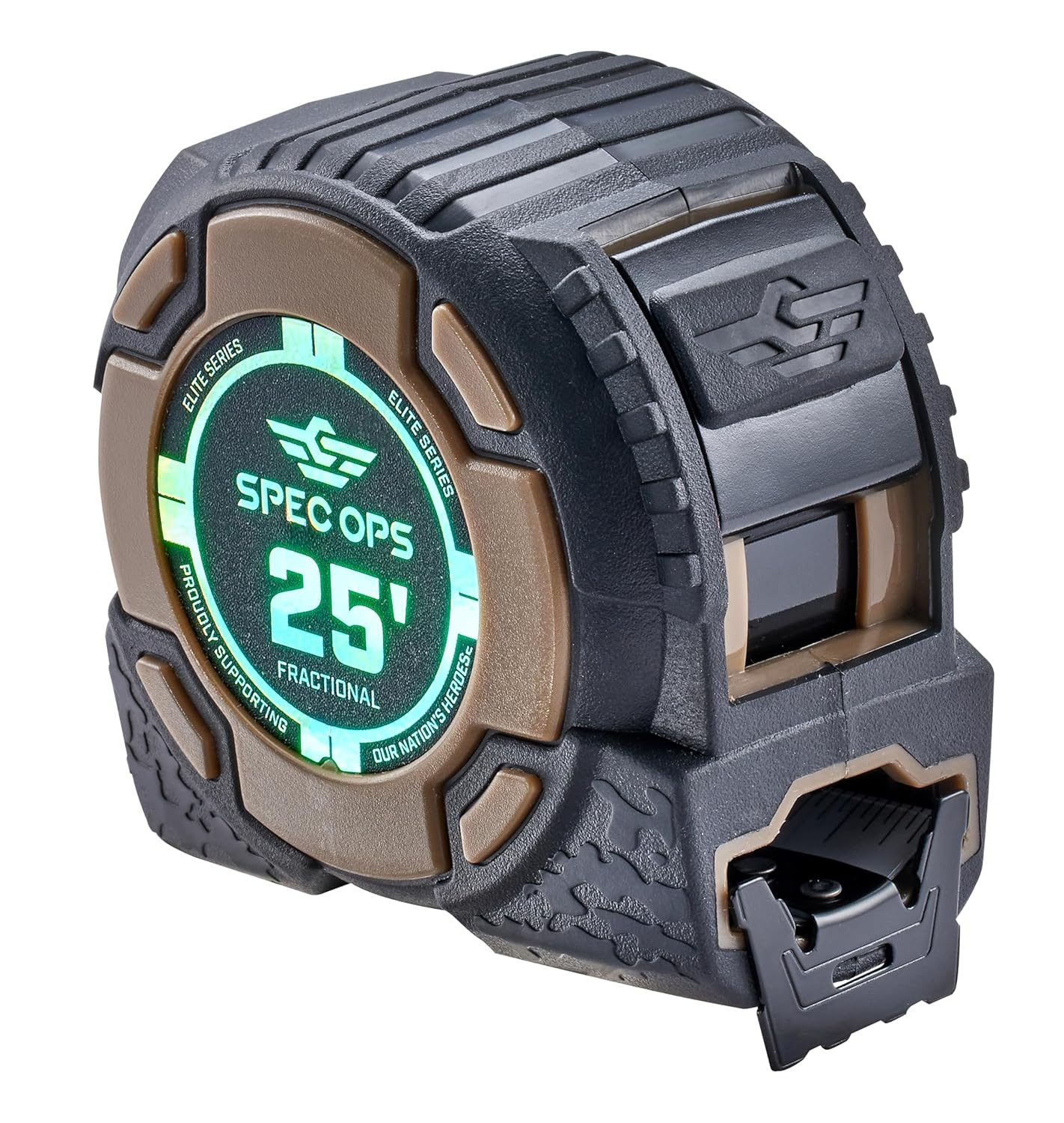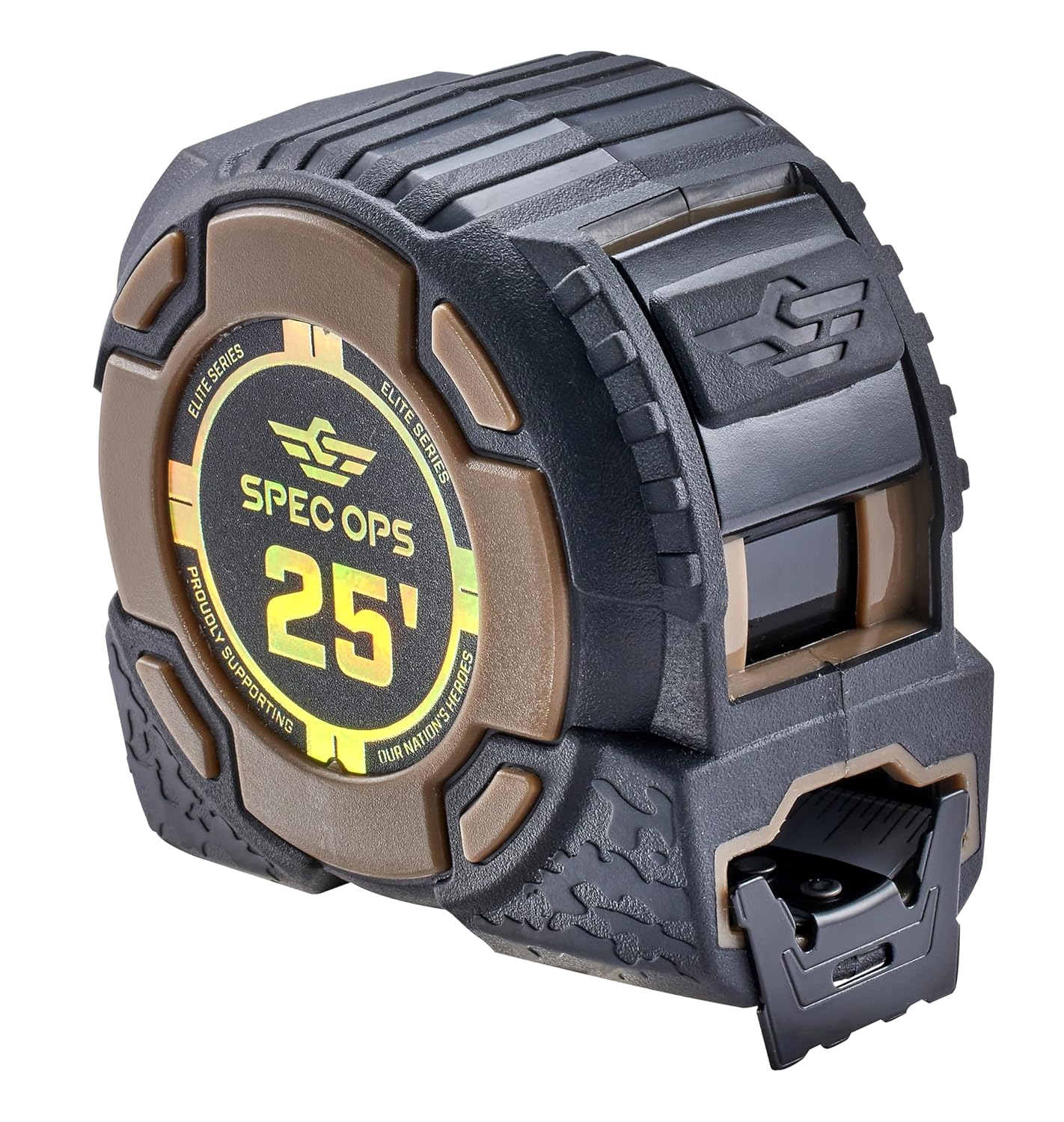 At Spec Ops Tools, we've engineered the ultimate Magnetic Elite Series Tape Measure, meticulously designed to excel in the most demanding professional settings. This Elite Series tool is not only engineered to withstand 200' drops onto packed dirt, guaranteeing exceptional performance on the world's most challenging job sites, but it also boasts a remarkable 12' NO BS Standout at 15° for a remarkable 15' of reach in real-world job site applications. Efficiency is paramount in the professional world, and that's why we've equipped it with a dual-sided printed blade featuring fractional markings, streamlining measuring and layout work while saving valuable time on the job. For low-light conditions or for those with less-than-perfect eyesight, we've prioritized visibility with a high-contrast, black-on-white printed blade, ensuring easy reading in any situation. Uncompromising durability is a standard we uphold, evident in the inclusion of 6"" of Tape Plate™ blade end protection and a MIL-X hyper tough nylon-coated blade, offering high abrasion resistance and 2X blade durability for a long-lasting tool. Safety is paramount for professionals. Our powerful Magnetic Hook, featuring rare earth magnetic technology, securely grips onto ferrous metals, providing an extra level of convenience on the job. The non-slip bat wing hook holds fast in multiple orientations, and it's compatible with the SRS retention system and wrist lanyard for added safety. We've also integrated the Secure Fast™ blade lock for seamless operation. Backed by our Spec Ops Five-Star hassle-free limited lifetime warranty, you can trust in the enduring reliability and performance of this Elite Series magnetic tape measure. We are dedicated to excellence and proudly support those who serve our nation, donating 3% of our proceeds to veteran and first responder causes with every purchase.