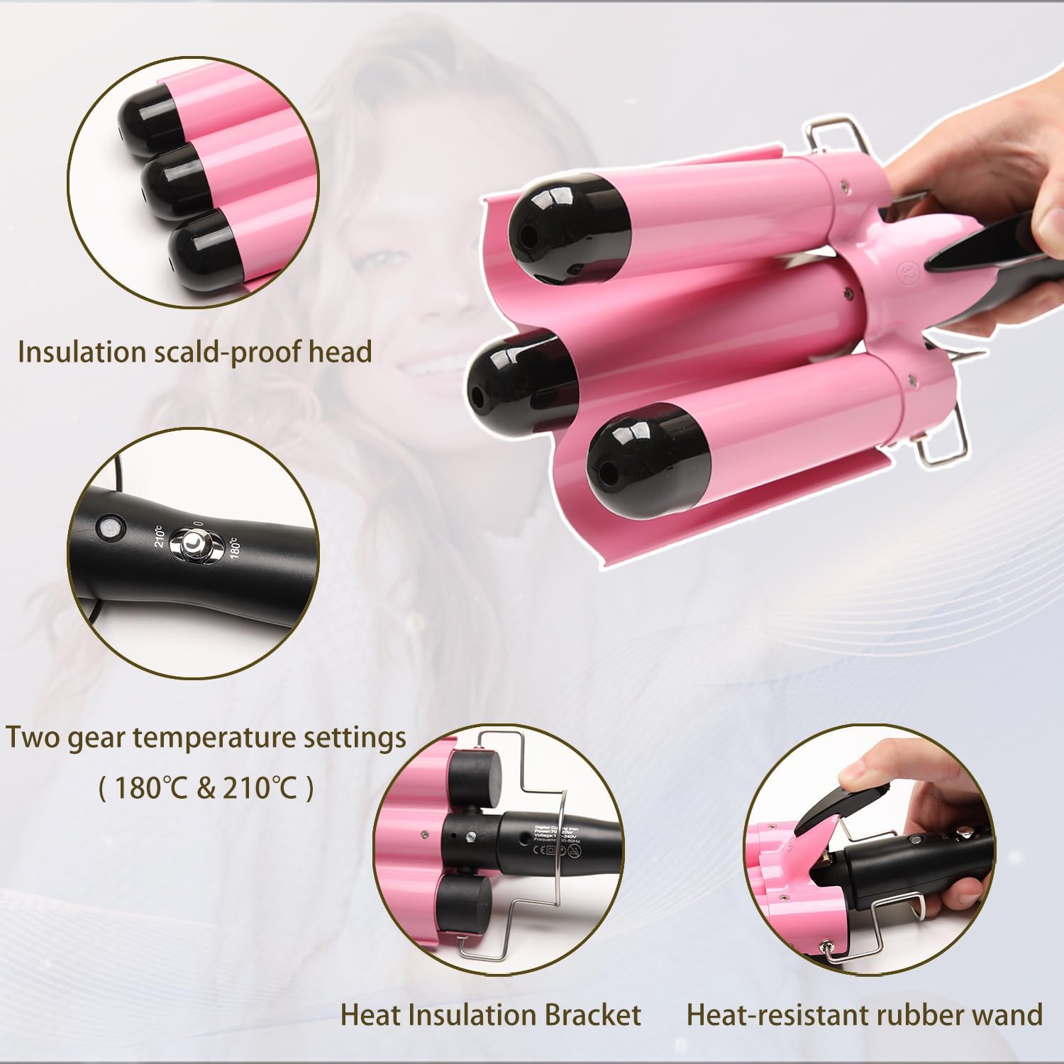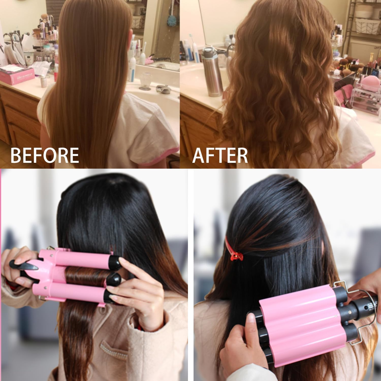 Dopheuor 2024 Newest 3 Barrel Curling Iron Jumbo 1.25 inch (32mm) Hair Curling Wand Crimper Instant Heating Adjustable Hair Curler with 2 Temperature Control, Pink