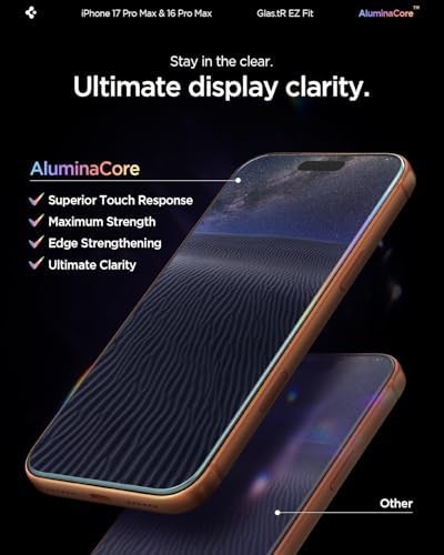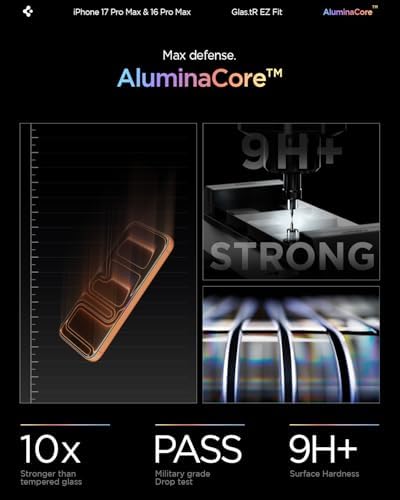 Superior Screen Protection: Made from new AluminaCore glass for the best ultimate screen protector against daily drops and scratches New AluminaCore Technology: High-purity alumina-silicate glass undergoes a ion exchange strengthening process to maximize protection Natural Touch and Clarity: Experience fast touch sensitivity with zero lag and total light transmittance for an ultra clear display Easy Guided Installation: Includes 2 EZ Fit screen protectors and installation kit for quick guided installation Compatible with iPhone 17 Pro Max screen protector, iPhone 16 Pro Max screen protector, and designed precisely to fit in Spigen Cases