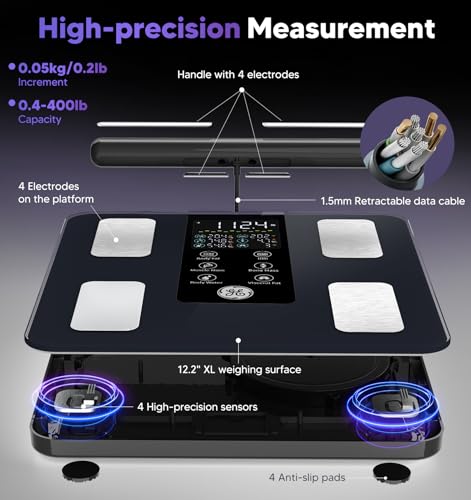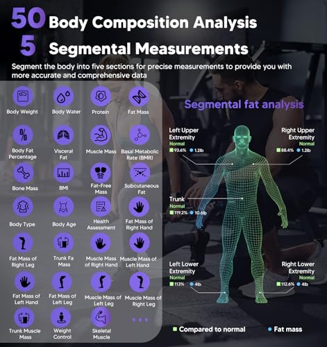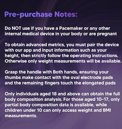 COMPREHENSIVE AND HIGHLY ACCURATE: The GE smart scale utilizes 8-electrode dual-frequency and segmental BIA technology, segmenting the body into five sections(four limbs and torso) for precise measurements to provide you with more accurate and comprehensive body composition data 50 BODY COMPOSITION METRICS: The GE body fat scale measures not only weight but also BMI, body fat, muscle mass, body water, bone mass, protein, visceral fat, BMR, skeletal muscle, subcutaneous fat, fat-free body weight, metabolic age, etc 7 METRICS SHOWS ON DISPLAY: The weight scale with body fat and muscle mass is equipped with an HD LED display, showing 7 key metrics including weight, BMI, body fat, body water, muscle mass, bone mass, and visceral fat. Once the Fit Profile app is downloaded and the initial setup is completed, these metrics can be viewed directly on the scale's display, eliminating the need to open the app each time. It makes health monitoring easy and convenient, great for personal or gym use USER-FRIENDLY APP FOR TRACKING AND SHARING: The free app Fit Profile provides detailed charts and saves historical body data so you can track the changes of your body composition over days, weeks, months, or years. Easy to set up and works with fitness apps including AppIe Health, for Fitbit, Google Fit, and you can also share your body data changes with your friends and family UNLIMITED USERS: The GE body composition scale has a large weighing surface measuring 12.2 * 13.2 * 1.3 inches (310 * 336 * 33.8 mm). It supports unlimited users and up to 9 profiles can be created, and it instantly recognizes the user when they step on the scale, perfect for families and fitness groups who want to monitor their body data to improve their health Precautions: Do NOT use if you have a Pacemaker or any other internal medical device in your body or are pregnant Note: If you notice a significant weight discrepancy, it may be because the scale was not calibrated to zero before use. Please step on the scale and then step off, wait until it displays zero, and then take the measurement.