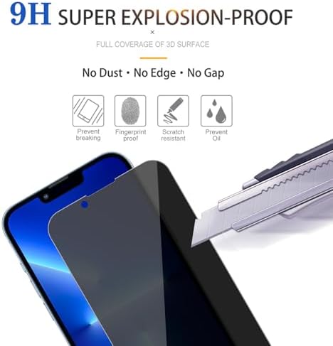 【Compatible with iPhone 13 Pro/ iPhone 13/ iPhone 14】Include 2 Pack Tempered Glass Privacy Screen Protector for iPhone 13 Pro/ iPhone 13/ iPhone 14. Please check your phone model before purchase. 【Privacy Protection】 Privacy glass screen is only visible to person who is directly in front of Screen. Protect your personal privacy effectively. 【Case Friendly】Compatible with most mobile phone cases. 【Easy Installation】 A handy installation tray is provided for your easy quick installation, not easy to fall off, no bubbles. 【Superior Quality】9H hardness privacy screen protector resists accidental drops and impacts. Light transmittance of 99.9%, maintain original touch experience and HD screen.