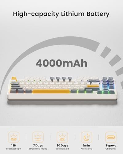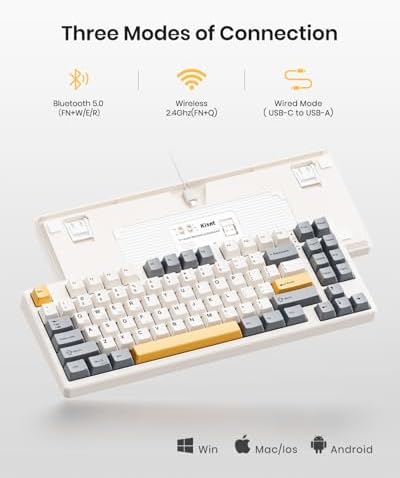 【Less Keys, More Desk】Crafted for users who value style and functionality, the KN85 series is a game-changer in both aesthetics and performance. As a 75% layout keyboard with 85 keys, it retains essential keys (F1-F12, arrow keys, shortcuts) while omitting the dedicated right-side number pad to keeping its compact form. Ideal for small desks, laptop setups, or anyone looking to maximize desk space efficiency. 【Connect How You Like】You will be obsessed with the tri-mode connectivity: Wired USB-C, 2.4GHz wireless, and Bluetooth 5.0(3 channels supported). Easily switch between Windows and Mac system to work across your PC, laptop, tablet, smartphone, or gaming console. Whether you’re plugging in for gaming or going wireless for working, it’s got you covered with minimal latency. When connected via the USB-C cable, it operates in wired mode and charges the built-in 4000mAh battery at the same time. 【RGB Backlighting& Programmable】The Bluetooth keyboard has 20 pre-set dynamic effects with adjustable colors and brightness. RGB backlights shine around the PBT keycaps and edges to create the glowing effect, they can be switched through the software or shortcut keys. Also you can use `Fn + ⬇` to dim or turn it off when not needed to extend battery life. Via the KN85 driver, all keys support macro customization, allows you to record and edit macros to improve your work efficiency and gaming competitiveness .(Note:The driver only supports windows system in wired/2.4G mode.) 【Custom Hot Swappable& Linear Switches 】Enjoy buttery smooth keystrokes with pre-lubed Bsun linear switches(45-50gf actuation). Best of all the switches are hot swappable with either 5-pin or 3-pin options, even beginners can easily swap in your preferred tactile/clicky switches to personalize your typing experience. It is a perfect starter keyboard if you want to get into customization. Combining a old school look with modern functionality, it’s also a specific niche gift for tech enthusiasts, gamers, students or professionals. 【Typing Redefined Starts from Kisnt 】Designed with your comfort in mind, this clacky keyboard is absorbing sound effectively. Enhanced with base dampener, silicone pad, along with layers of sound-dampening foam, it delivers a satisfying “thocky” sound, less hollow sounding, just indulge in pure typing bliss and less distracting. If you're looking to upgrade from traditional keyboards to a creamy one with every keystroke feel consistent, the Kisnt gasket mounted keyboard is definitely your best budget choice. 【Warming Tips】When use the Bluetooth mode, make sure long press the combination key[FN+W/E/R] for 3-5s until the indicator light flashes quickly to enter paring mode. For the best battery life and performance, please fully charge the keyboard before first use. Charging frequency depends on your usage and settings. As a general guide: With RGB lighting on: Charge every 2–3 days (approx. 13 hours of use per charge); Moderate use with RGB on (≈4 hrs/day): Charge weekly; With RGB off: Charge every 2–3 weeks (15–20 days of use). 【Kisnt Grows with You】Any quality issues in 2 years? A new one on us. Typing goes on, our refinement never stops. Each Kisnt keyboard is never finished at launch. It evolves with you—keystroke by keystroke.