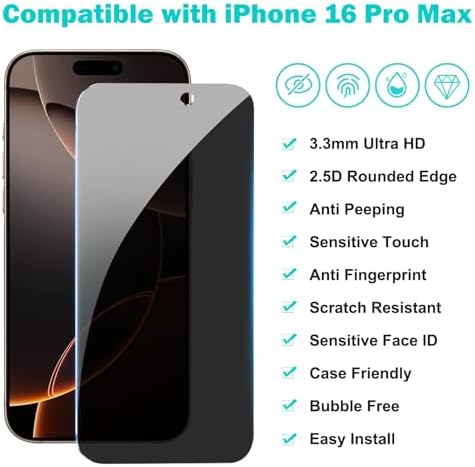 [Designed for iPhone 16 Pro Max] - PEHAEL's screen protector is specially designed for the iPhone 16 Pro Max 6.9 inch. Include 3 privacy screen protectors, 3 tempered camera lens protectors, a precision installation frame, and a cleaning kit. *Two types of packaging boxes are randomly shipped. [Full Coverage Protection] - This screen protector offers edge-to-edge protection for your device, using military-grade explosion-proof glass. It is also compatible with most phone cases, the appropriate size ensures that the phone case won't squeeze the screen protector after installation, providing double protection for the edges of the phone. [High Privacy Protection] - The necessary choice for you in public places. Select the optimal anti-peeping angles for the anti-spy coating to balance privacy and visual comfort. Protect your personal privacy and sensitive information from being seen by people nearby who might peek. To better protect your phone, 3mm nano-scale ultra-thin aviation glass is chosen as the material, it also protects your eyes from harsh light, ensuring a softer visual effect. [Night Shooting Function] - This feature includes a specially designed dark circle phone camera lens protector. The camera lens protector uses new technology to seamlessly integrate augmented reality, maintaining high light transmittance and effective night shooting capabilities without needing a separate flash hole, ensuring original photo and video quality when the flash is used at night. [Face ID Compatible] - Precisely cut the screen for the iPhone 16 Pro Max. To ensure the perfect use of the Face ID function, it is recommended to use the included precision mounting frame for precise alignment and installation. The high-quality glass material supports the use of the Face ID function, and high-pixel photos can also be taken through the front camera.