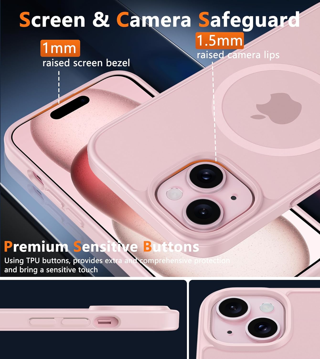 FNTCASE for iPhone 15 Case: for iPhone 14 Case & iPhone 13 Case [Compatible with Magsafe] Translucent Matte Magnetic Phone Cover - Military Grade Drop Protection Shockproof Protective Cases - Pink
