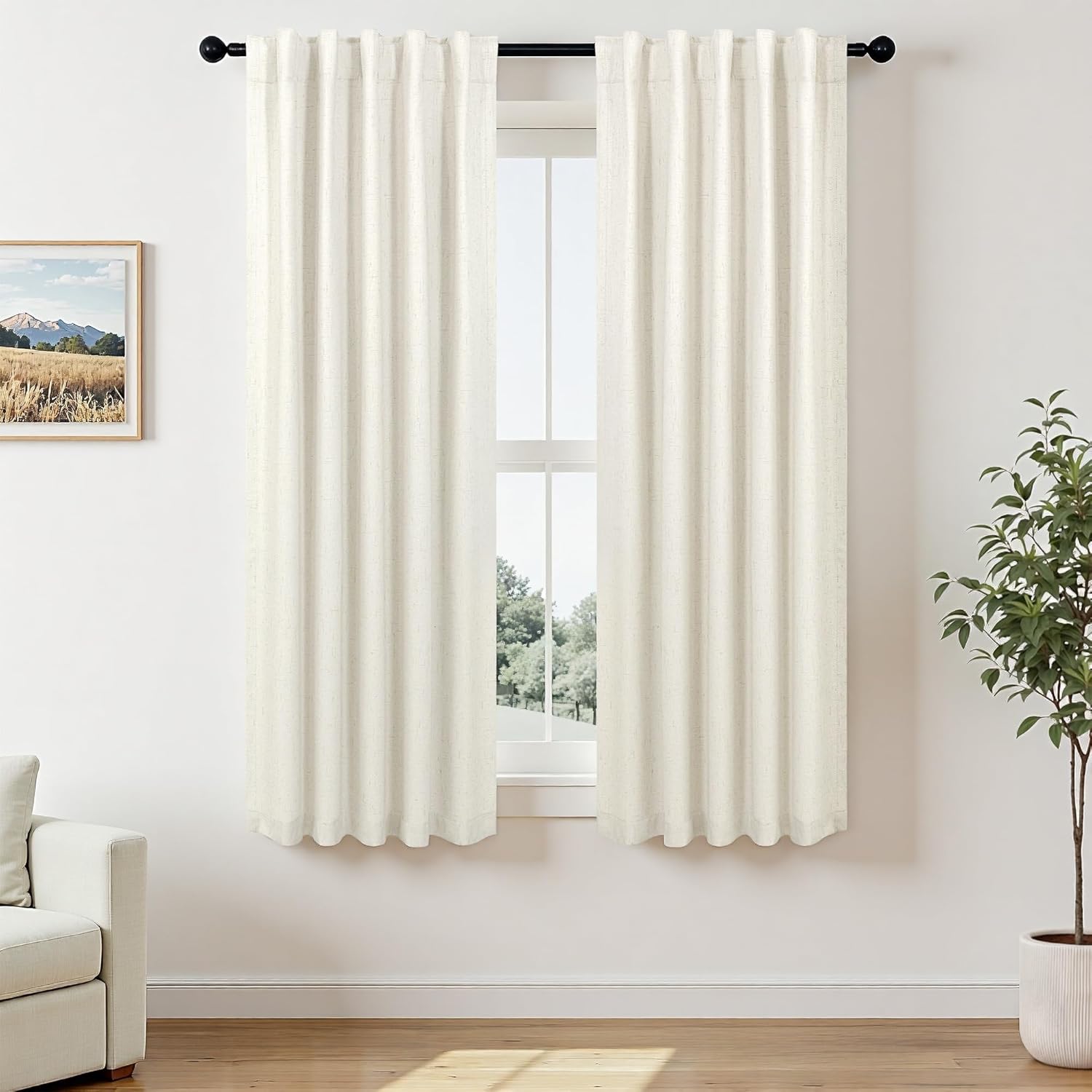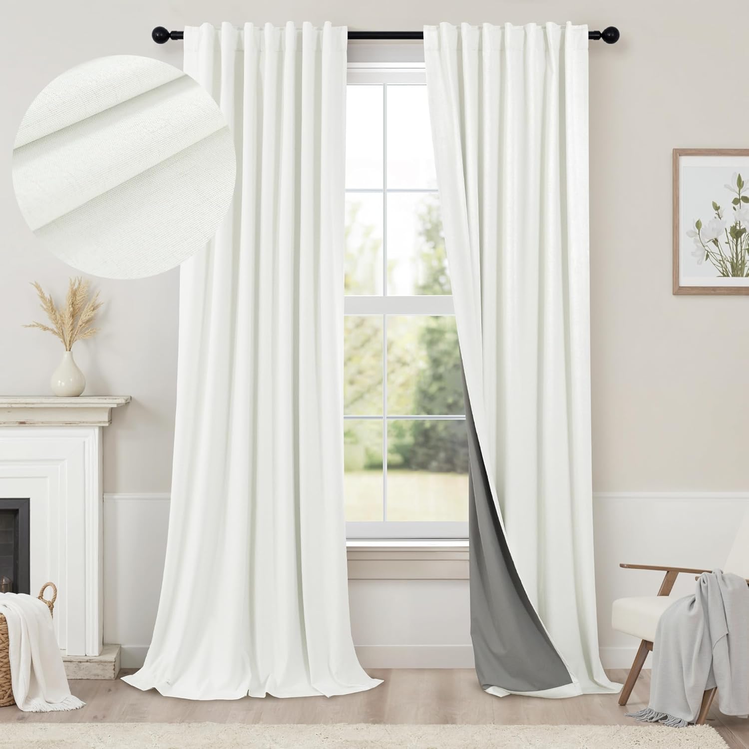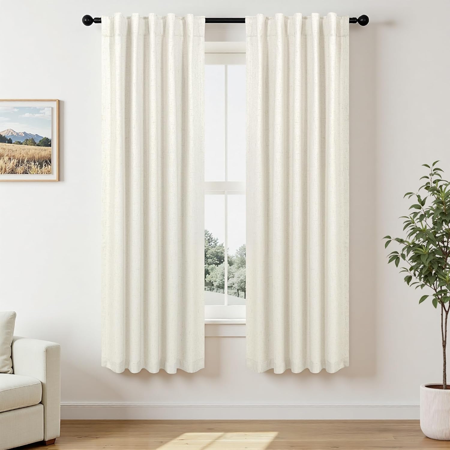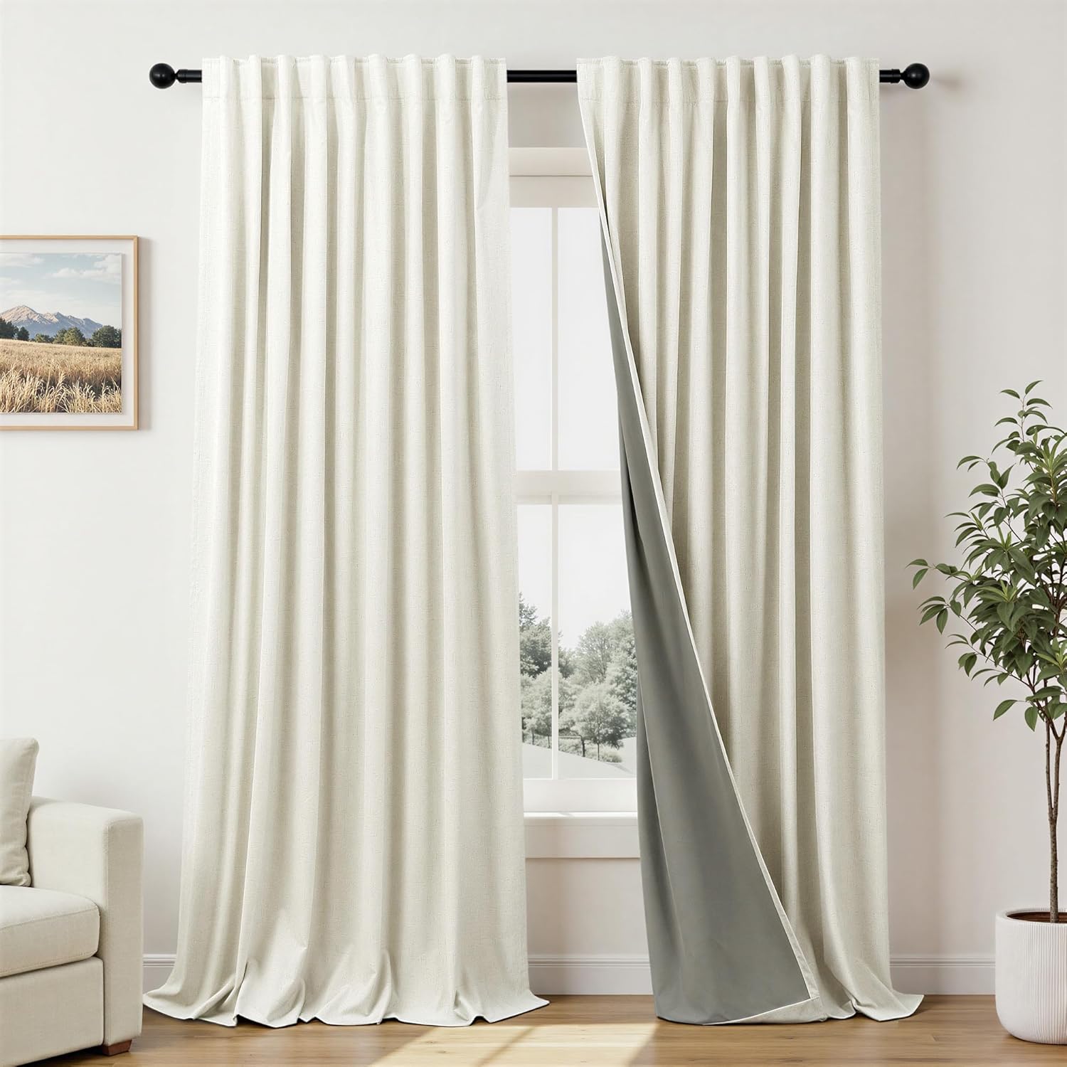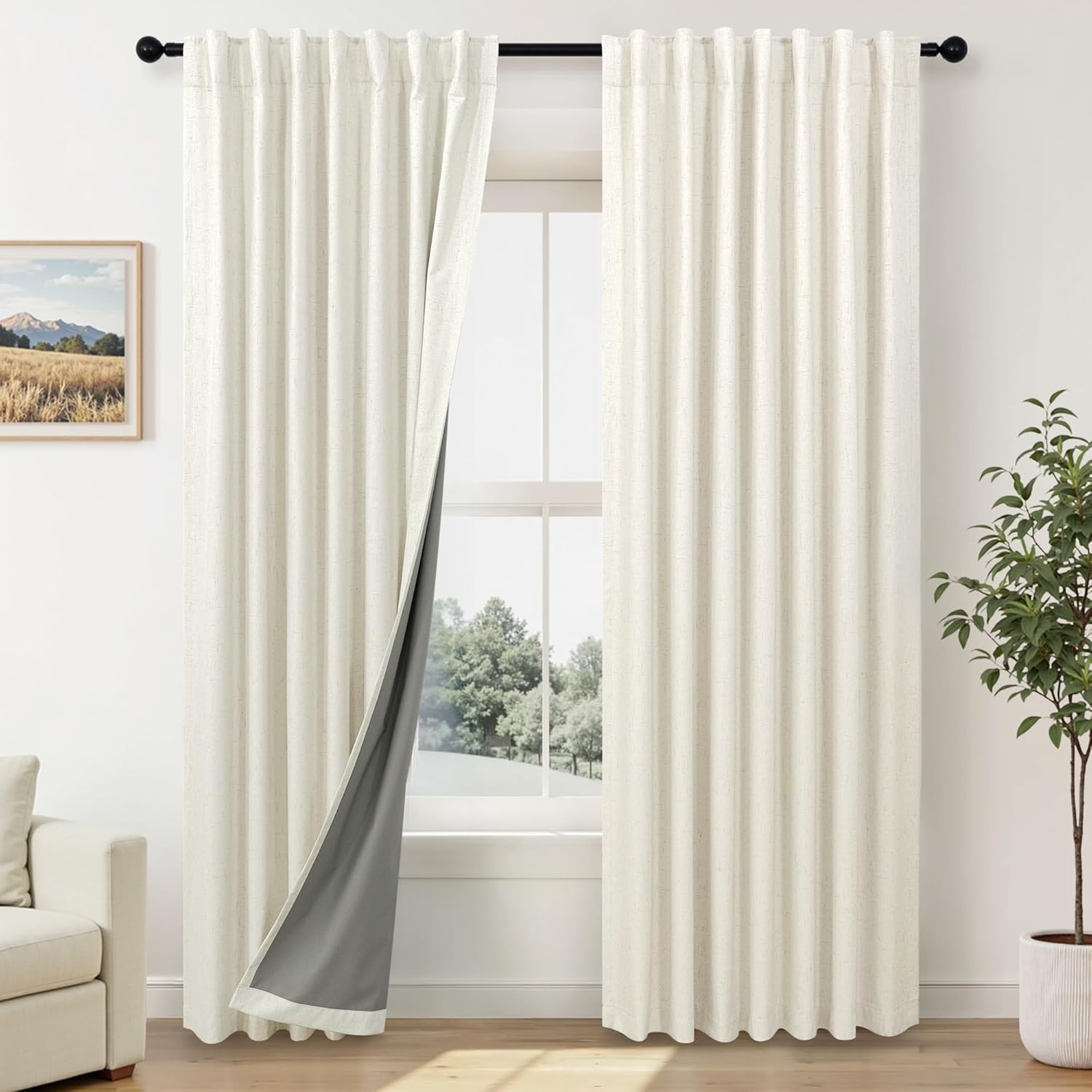 100% Blackout Curtains 84 Inch Length 2 Panels Set Neutral Boho Linen Farmhouse for Bedroom Windows Living Room Darkening Thermal Insulated Drapes Natural Cream Ivory 7ft Long Back Tab Pleated Pocket