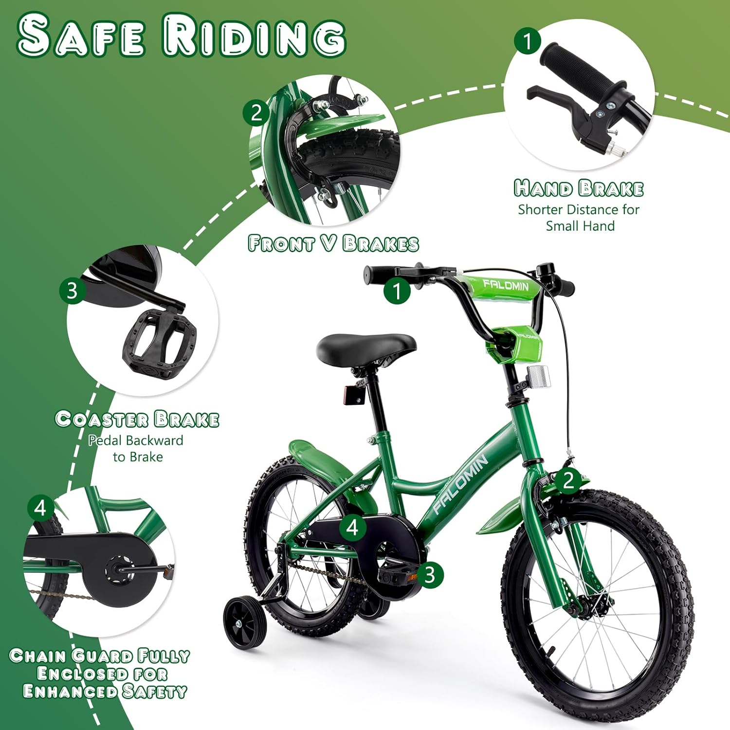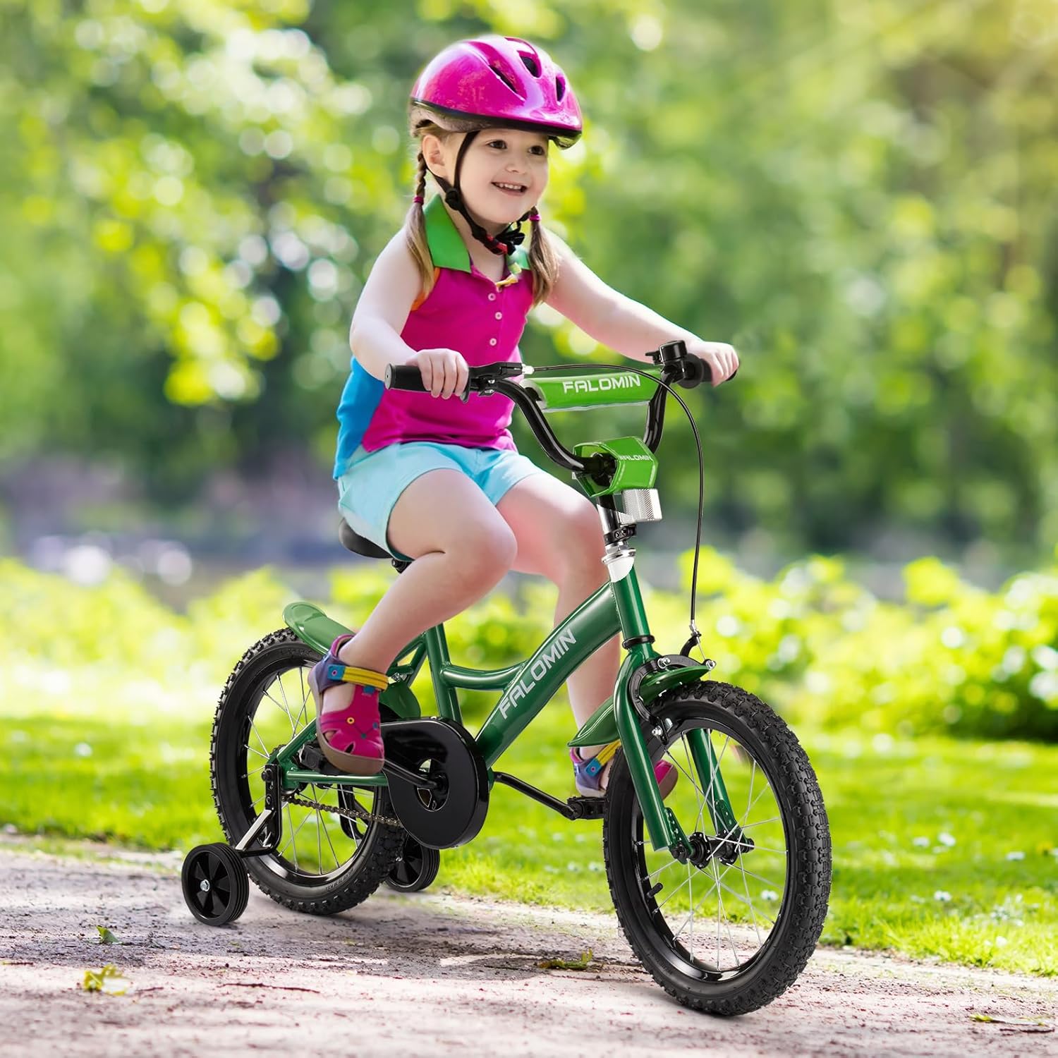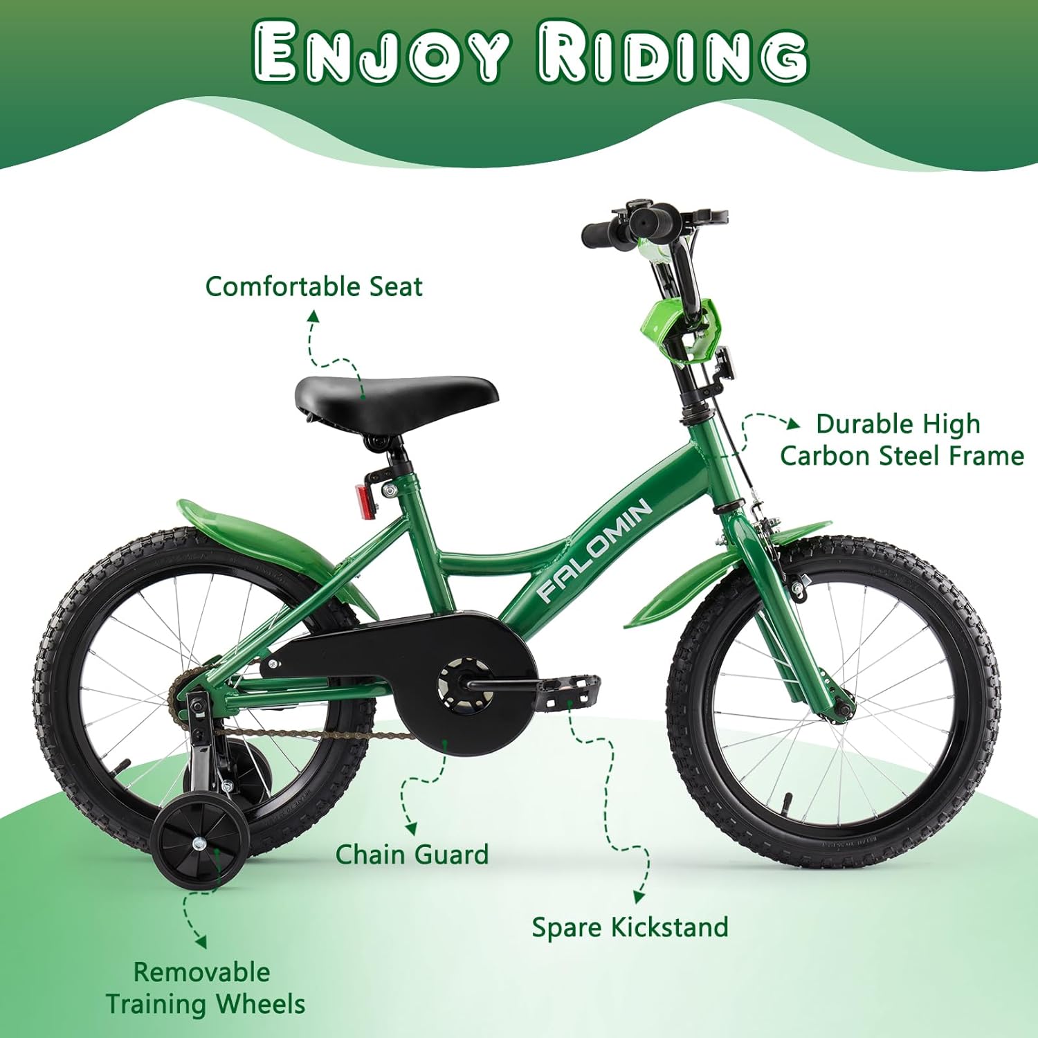 - 【Designed for Children】Falomin children's bicycle features an adjustable seat and handlebars that grow with your child! With removable training wheels on the 14 and 16 inch models, and a kickstand on the 18 inch model, even new riders can easily find their balance and pedal with confidence