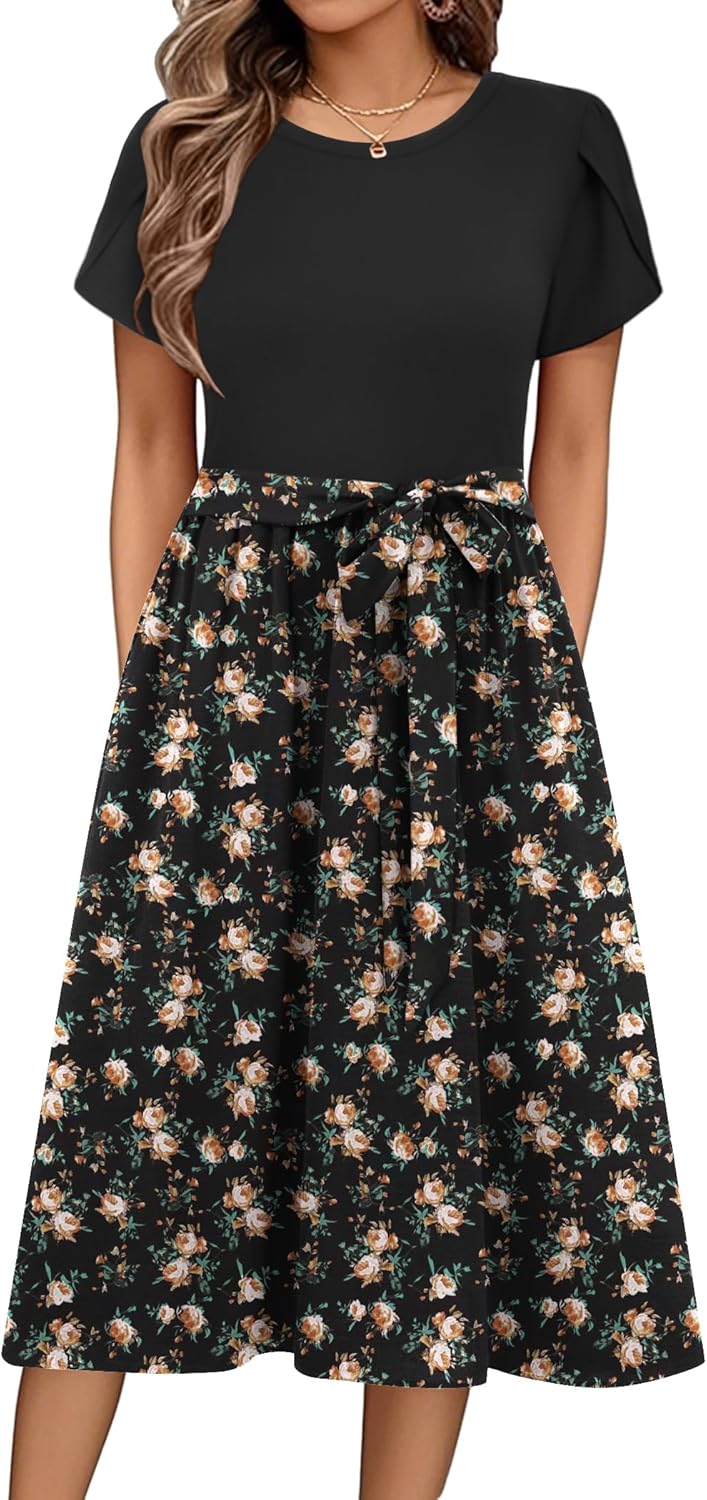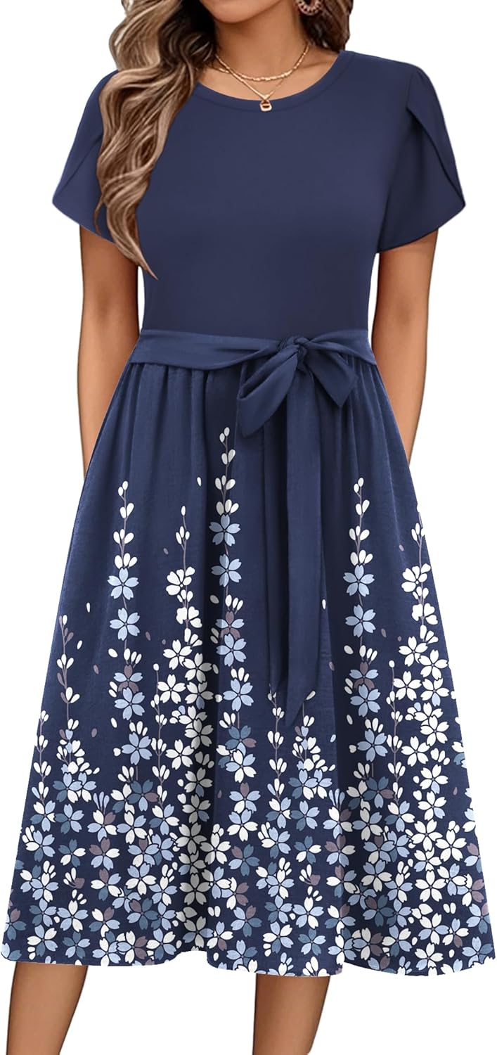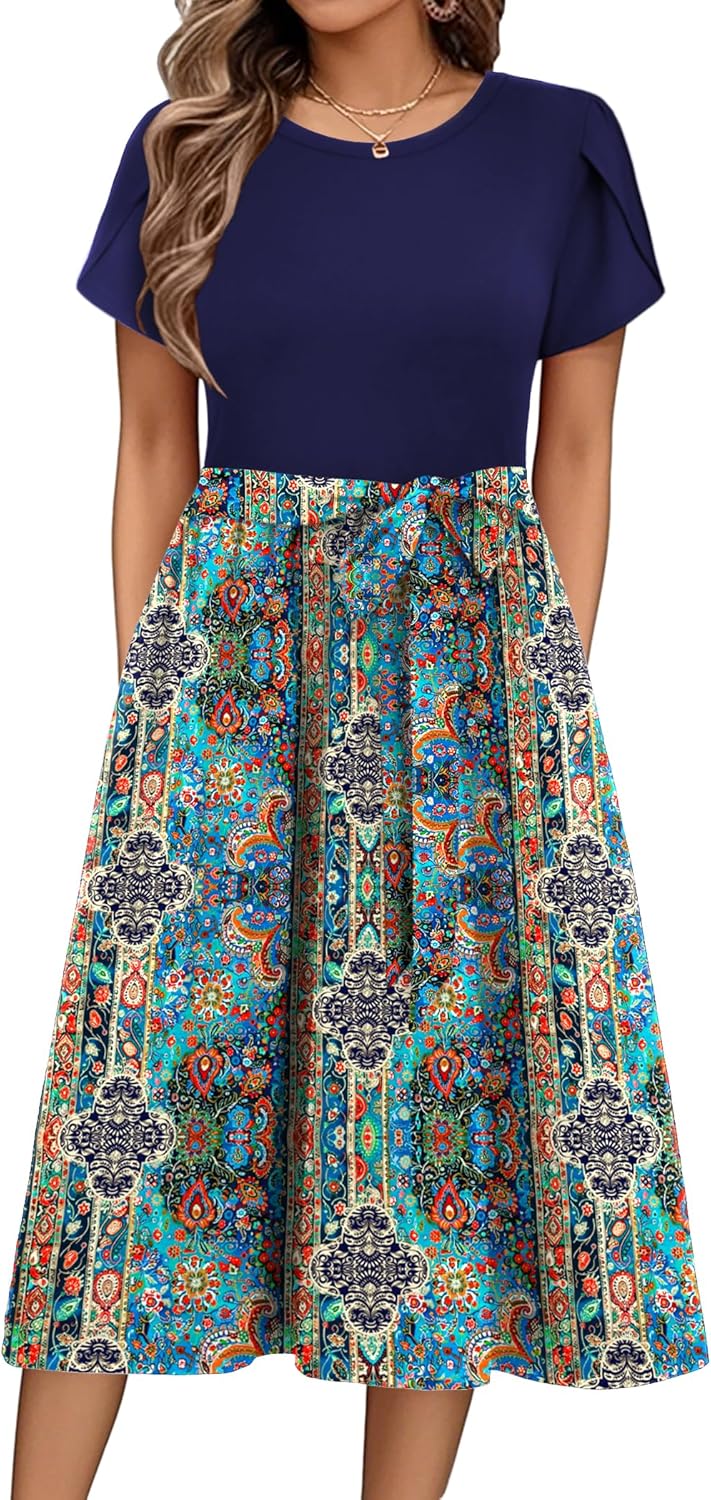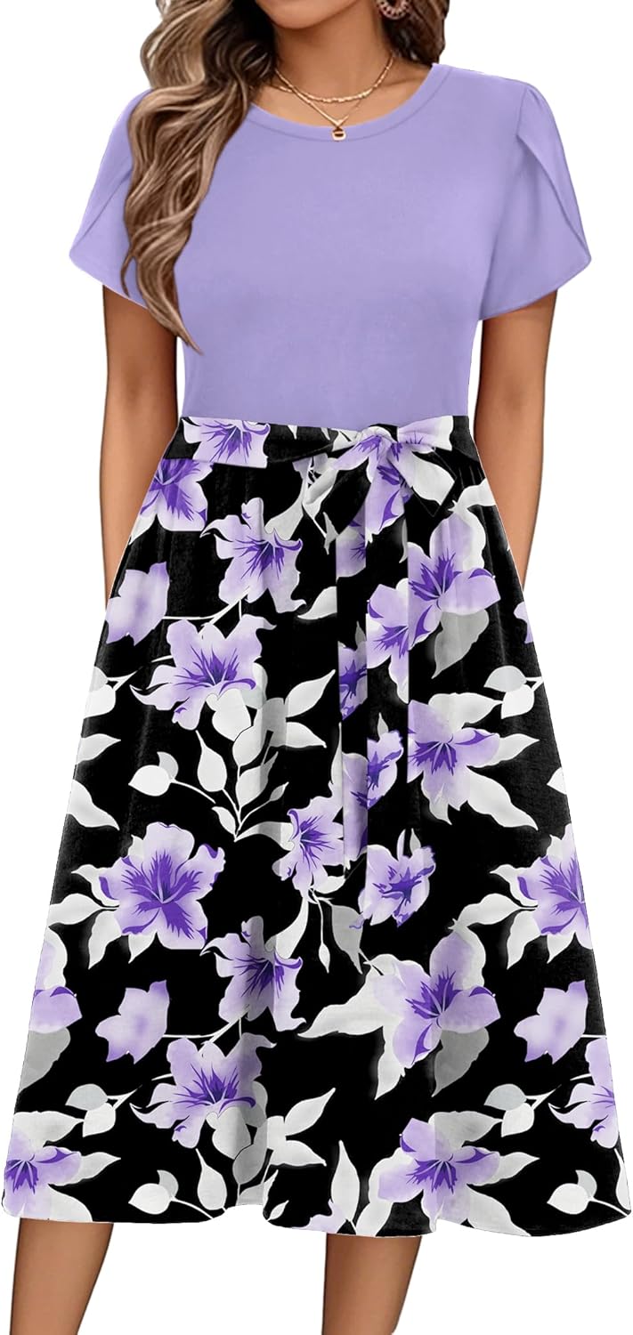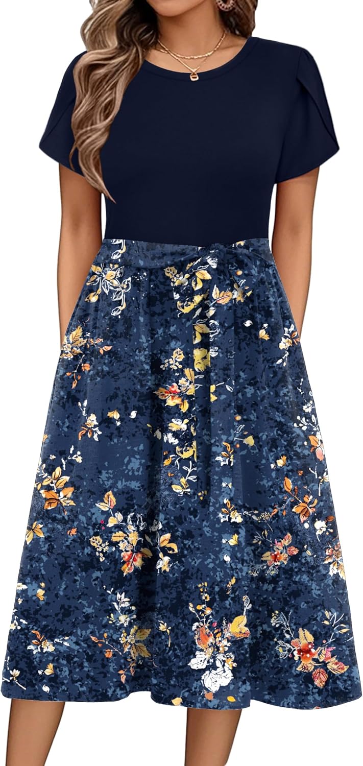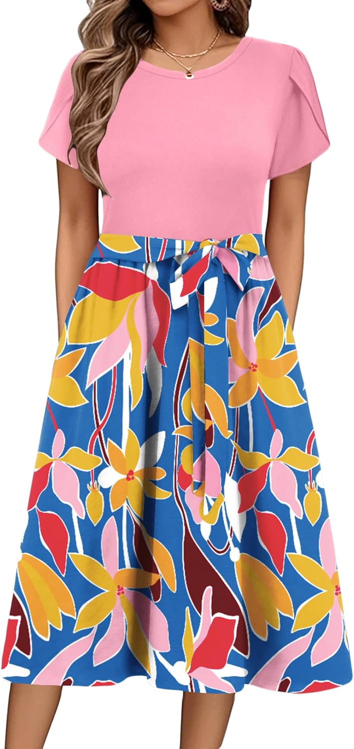 Zeagoo Womens Midi Dress Summer Short Sleeve Dress with Pockets 2025 Casual Floral T-Shirt Dress Flowy Beach Sundress