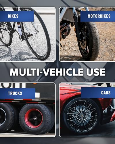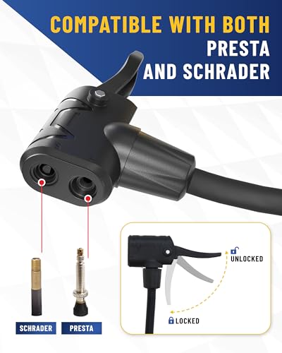 ONE PUMP FOR ALL YOUR BIKES – Works with both Presta and Schrader valves; no need for extra adapters; perfect for road bikes, mountain bikes & more KNOW YOUR EXACT PRESSURE – bicycle tire inflator gives precise 3-200 PSI readings in 0.1 PSI increments with ±2 PSI (1% FS) accuracy; big, easy-to-read display REACH EVERY VALVE EASILY – 16-inch hose gives you extra flexibility; better than short hoses on other bicycle pumps ALWAYS READY FOR ANY TIRE – Use it on bikes, motorcycles, SUVs, and even cars; the perfect air compressor attachment for presta valves CONTROL YOUR INFLATION – Adjustable pressure lever lets you inflate slowly or quickly; perfect for tubeless setups and fine-tuning your tire pressure