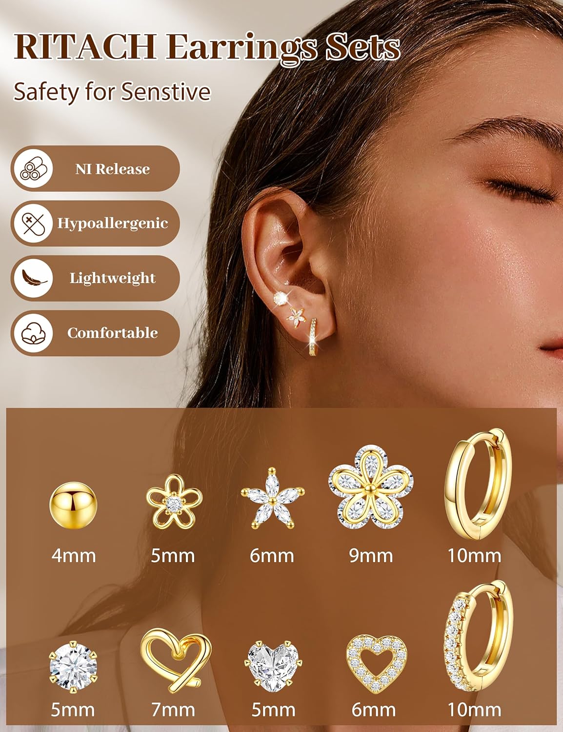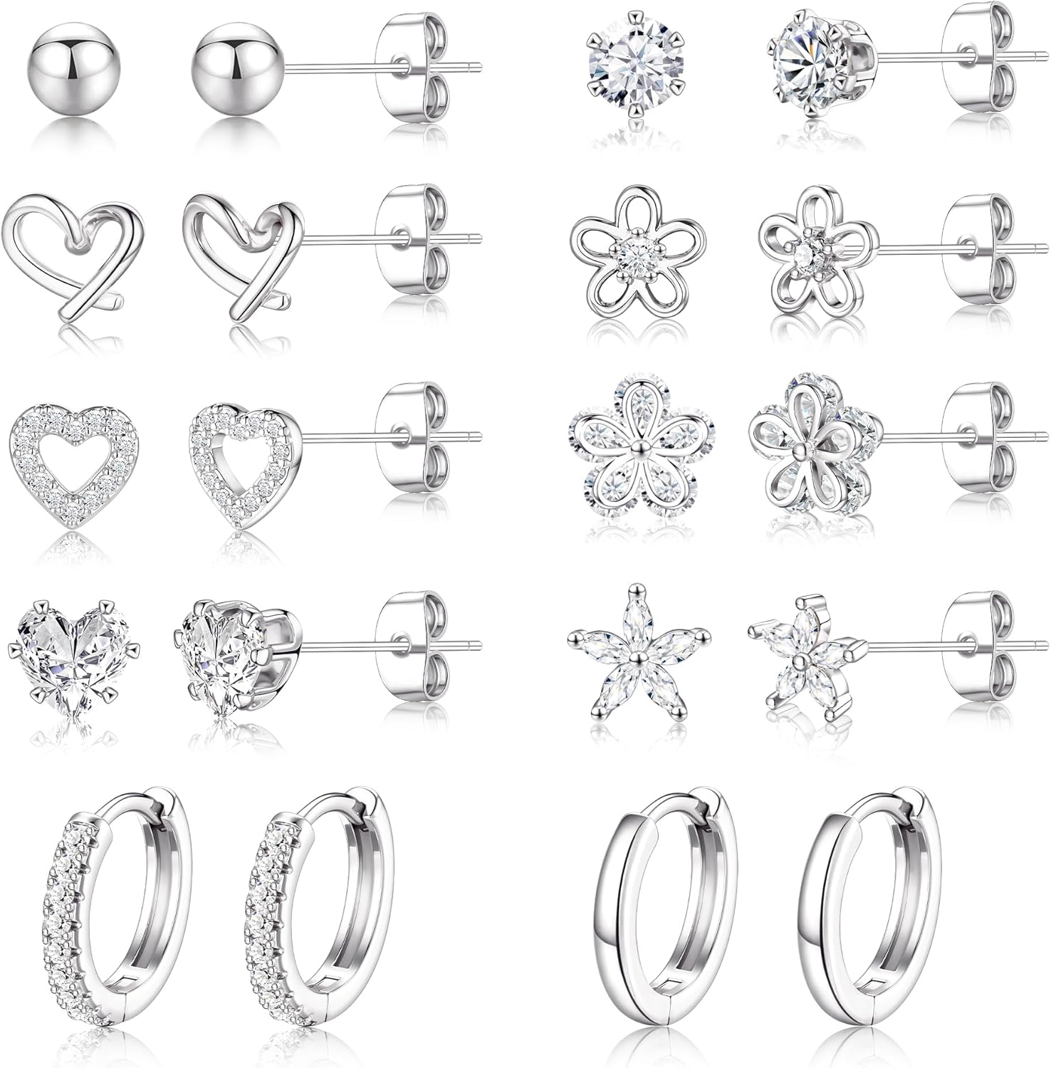 Small Gold Stud Earrings Set for Women - 14K Gold Plated CZ Huggie Hoops Hypoallergenic Earrings Dainty Flower Heart Stud Earrings for Jewelry Gift
