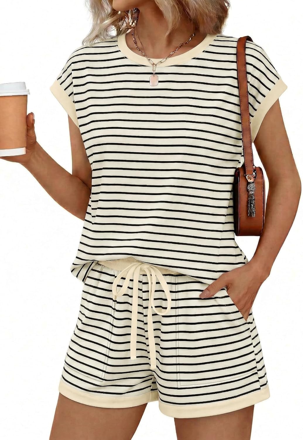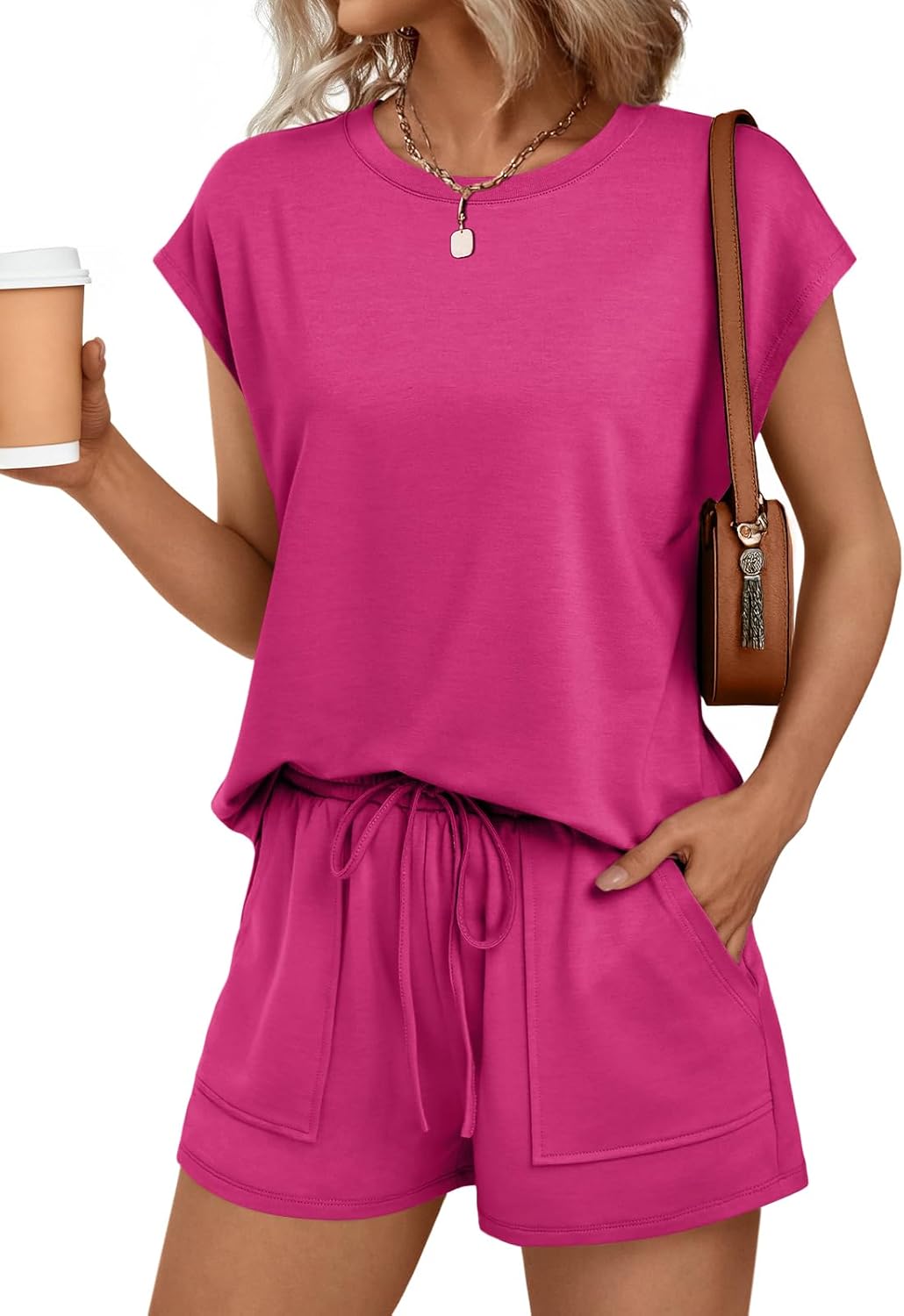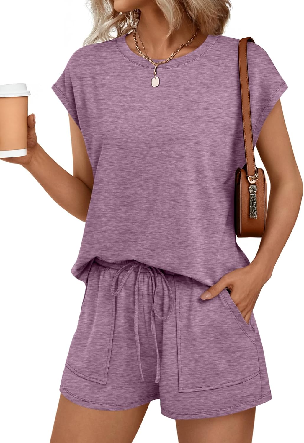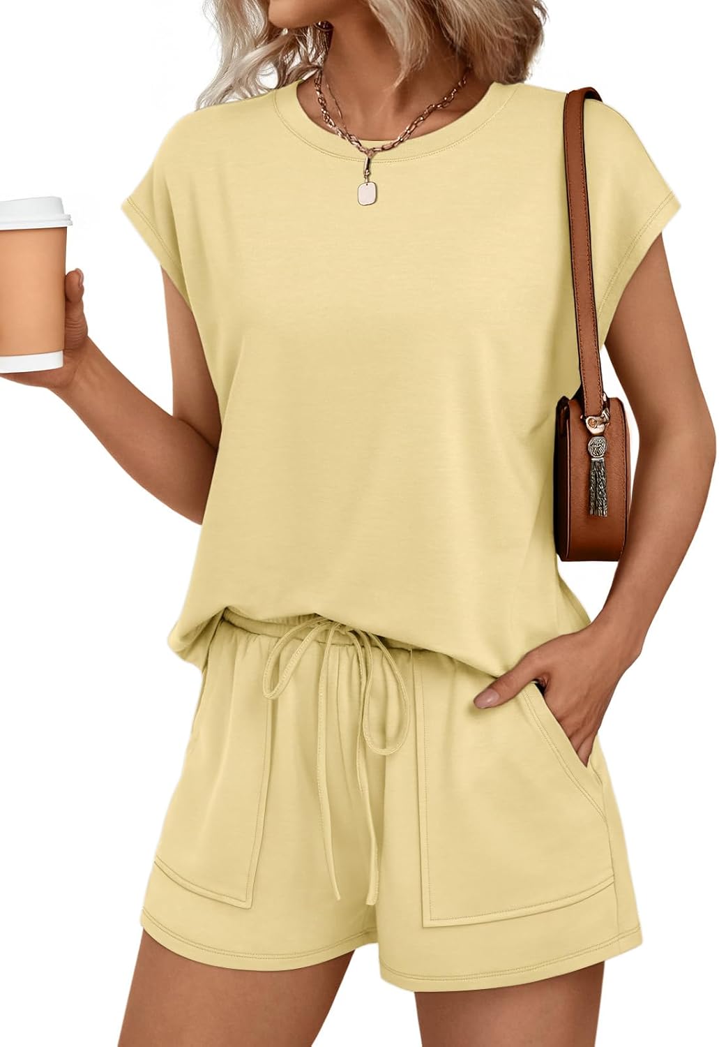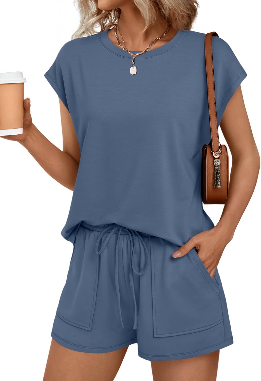 AUTOMET Womens Crew Neck Two Piece Short Sets Cap Sleeve Drawstring Summer Sweatsuit with Pocket