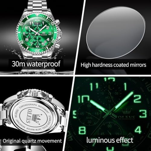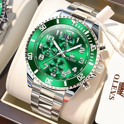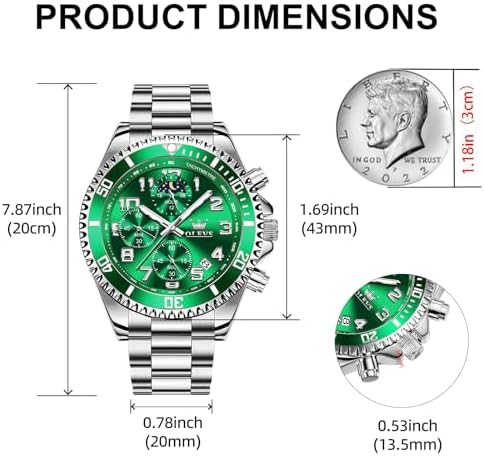 Modern Green Dial & Silver Aesthetic:Featuring a vibrant green dial paired with a polished silver-tone finish, this mens watch captures the latest fashion trends. Suitable for business meetings or casual social events, it adds a unique, sophisticated touch to any adult man's style Chronograph & Date Function:Equipped with three sub-dials for 1/10 second, minute, and second tracking, this chronograph watch ensures accurate timing. The analog display includes an easy-to-read date window at 3 o'clock, helping busy professionals stay organized easily Durable Stainless Steel & Personalized Fit:Crafted with a 20mm (0.79") silver stainless steel band and a 41mm (1.61") case. The 11mm (0.43") thickness provides a masculine profile. We include an adjustment tool for the link bracelet to ensure a secure, comfortable fit for all-day wear 3ATM Waterproof & Luminous Enhanced Visibility:Rated 3ATM waterproof against rain, splashes, and hand washing. The luminous hands and hour markers are designed for clear readability in low-light environments, making it a reliable accessory for late-night events, theater outings, or travel Sophisticated Gift Choice for Milestones:Presented in a premium gift box, this green dial watch is a versatile choice for Father’s Day, graduations, or anniversaries. It is a reliable gift for husbands, fathers, or partners who appreciate a blend of bold color and timeless design