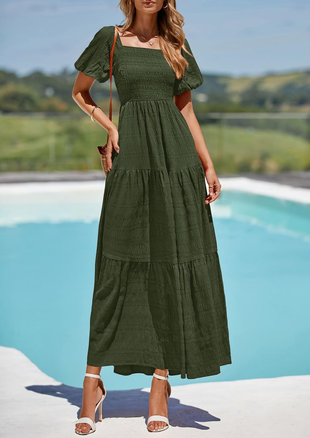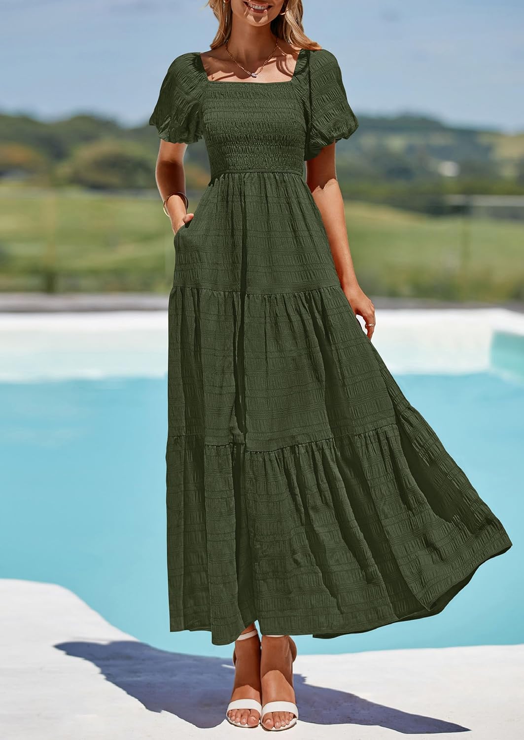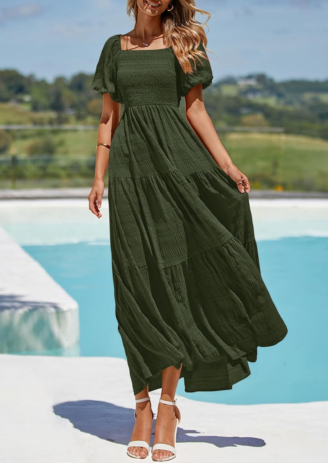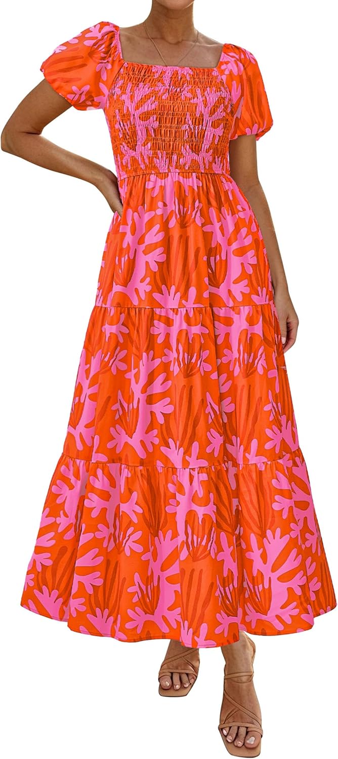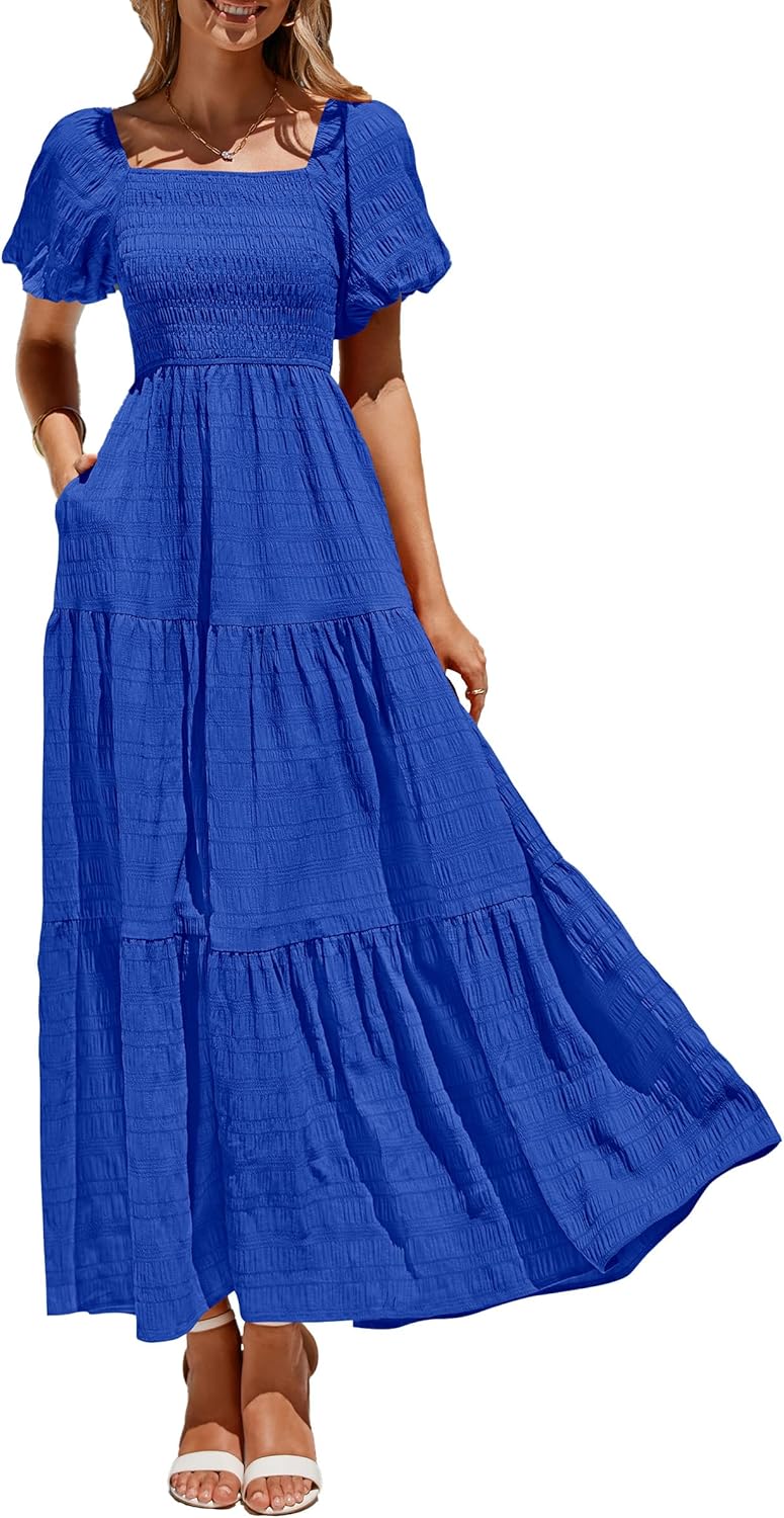 PRETTYGARDEN Womens Summer Puff Short Sleeve Maxi Dress Square Neck Smocked Tiered Ruffle A Line Long Flowy Beach Dresses