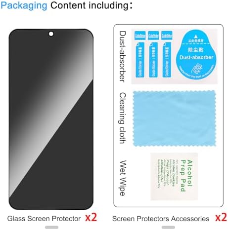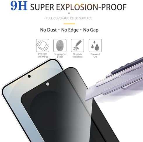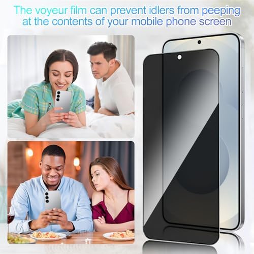 【Compatible with Samsung Galaxy s25】Include 2 Pack Tempered Glass Privacy Screen Protector for Galaxy S25【Support Finger Print Unlock】. Please check your phone model before purchase. 【Privacy Protection】 Privacy glass screen is only visible to person who is directly in front of Screen. Protect your personal privacy effectively. 【Case Friendly】Compatible with most mobile phone cases. 【Easy Installation】 A handy installation tray is provided for your easy quick installation, not easy to fall off, no bubbles. 【Superior Quality】9H hardness privacy screen protector resists accidental drops and impacts. Light transmittance of 99.9%, maintain original touch experience and HD screen.