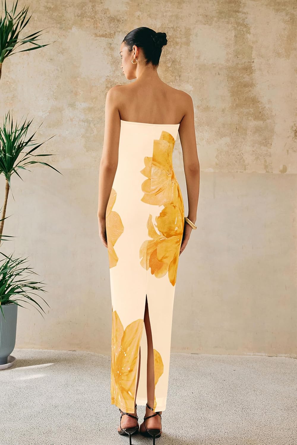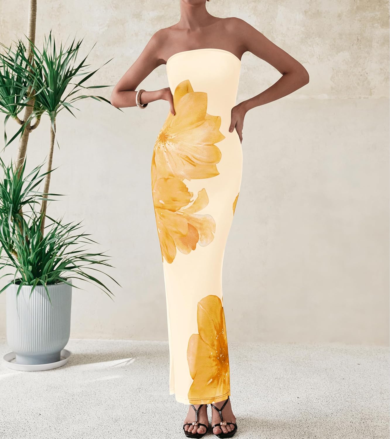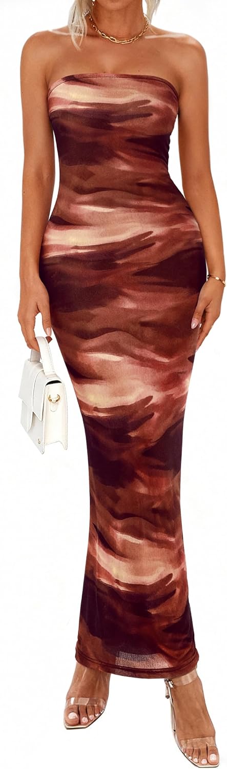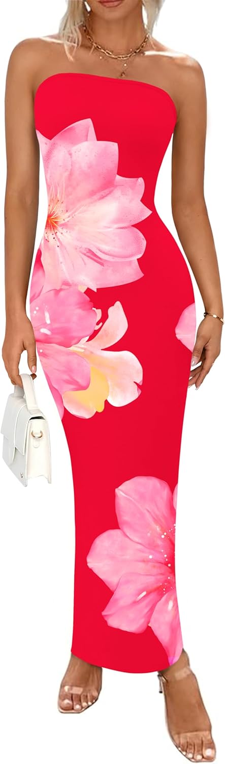 PRETTYGARDEN Women Summer Strapless Maxi Dress Bodycon Floral Sexy Long Wedding Guest Dress Formal Tube Mesh Cocktail Dresses