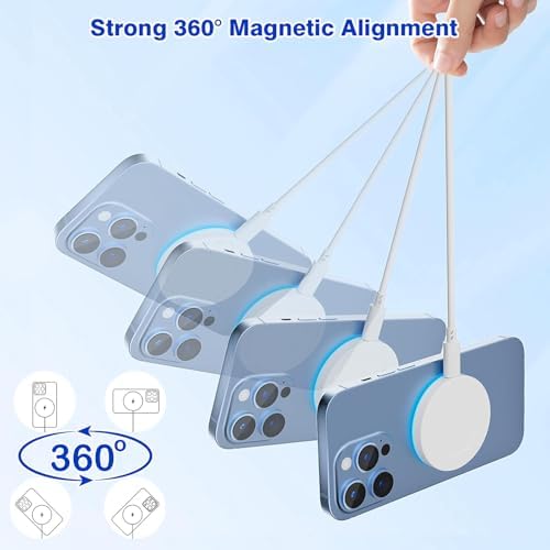 15W Portable Wireless Charger iPhone:with a 20W USB C Power Adapter,the Apple magnetic charger for iPhone supports up to 15W fast magnet charging speed for your iPhone 16/iPhone 15/iPhone 14/iPhone 14/iPhone 12 Series,fast charging your iPhone 14 to 50% in just 30 minutes and from 0 to 100% in just 2-2.5 hours, 3X faster then the original 5W iPhone Charger Magnetic Charger for iPhone 16/15/14/13/12 Series:This iphone magnetic charger supports up to 15W fast magnet charging speed for your iPhone 16 Pro Max/16 Pro/16/16 Plus/15 Pro Max/15 Pro/15/15 Plus/14 Pro Max/14 Pro/14/14 Plus/13 Pro Max/13 Pro/13/13 Mini/12/12 Pro/12 Mini/12 Pro Max and AirPods 4 3 2 Pro.Note:Magnetic iphone charging pad is supported with no case or mag-safe case,a normal case is not supported Magnetic,Stable 360° Adsorption Mag Safe Charger:Magnetic iPhone Charger firmly holds your iPhone while charging,no sliding or falling off, provides you a fast,safe and charging experience.The iPhone wireless charger fast charging pad features auto-alignment technology and a robust magnetic hold to ensure that your iPhone stays securely in place while charging 6FT Safe and Fast Apple Wireless Charger:this magnetic wireless charger iPhone pad is better at heat dissipation,the iPhone magsafe charger with built-in smart chip provides over-current,over-voltage,short-circuit,over-temperature and other protection to protect your phone battery from damage,this iPhone charging pad supports charging iPhone/AirPods, but DO NO SUPPORT Apple watch charging 20W USB C Block & 6FT Cable & Apple magsafe charger:The Package includes 1Pack 15W magnetic iPhone charging pad with 6FT/1.8m/6foot Charging Cable,1Pack 20W iPhone 16 USB C Charger Block.If there is any issue while using the mag-safe charger,welcome to let us know. Notice: make sure your device supports wireless charging technology, and DO NOT USE the wireless charger in high temperature environment just in case the charger pad will stop charging