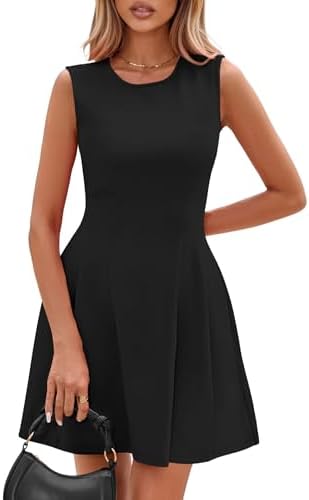 Tips: XS=US 0-2, S=US 4-6, M=US 8-10, L=US 12-14, XL=US 16. Crafted from lightweight, breathable fabric with just the right amount of stretch, this dress drapes over your curves gracefully while offering complete freedom of movement Chic Designs: The classic fit and flare silhouette features a fitted bodice that gracefully transitions into an a-line skater skirt, creating a flattering shape for all body types. Make a stunning statement with this sleeveless dress Matching Style: Dress it up with heels and statement jewelry for evening elegance, or pair it with flats for a relaxed daytime look. Layered under a tailored blazer, it transforms into polished office attire ideal for business settings Occasions: The stunning solid color adds a pop of confidence to your wardrobe and the simple design is ideal for various occasions from casual outings to semi-formal events, wedding, cocktail, dinner party, graduation, date night, office wear Color Options: white graduation dresses; beige short formal dress; pink date night dress for women; green homecoming dresses; red party dress for women; blue cocktail dress for women wedding guest; black office dress; dusty blue dinner dress