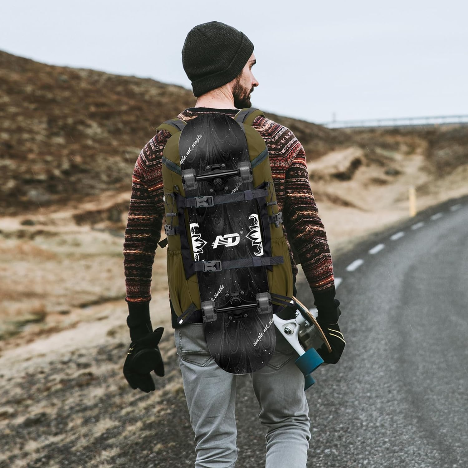 30L Skateboard Backpack Information Fabric: Oxford Cloth Weight: 1.2lbs Capacity: 30L Dimensions: 19.2"*11"*7.5" Target user: Unisex Used for: Skateboard Sports Outdoor Hiking Traveling Number of exterior pockets One front zippered pocket One main zippered pocket Two side pockets One top pocket Features 1. The fabric is scratch-resistant, wear-resistant and water-resistant 2. 2L hydration bladder can be placed 3. The straps are reinforced with stitches 4. The back and the shoulder strap are filled with 3D sponge 5. The chest strap and the waist belt can be adjusted 6. The chest strap buckle has an emergency whistle 7. Trekking poles can be placed in the front, and sleeping bags can be placed in the bottom buckle 8. Elastic bands are on the sides and front 9. Outer webbing is on the top