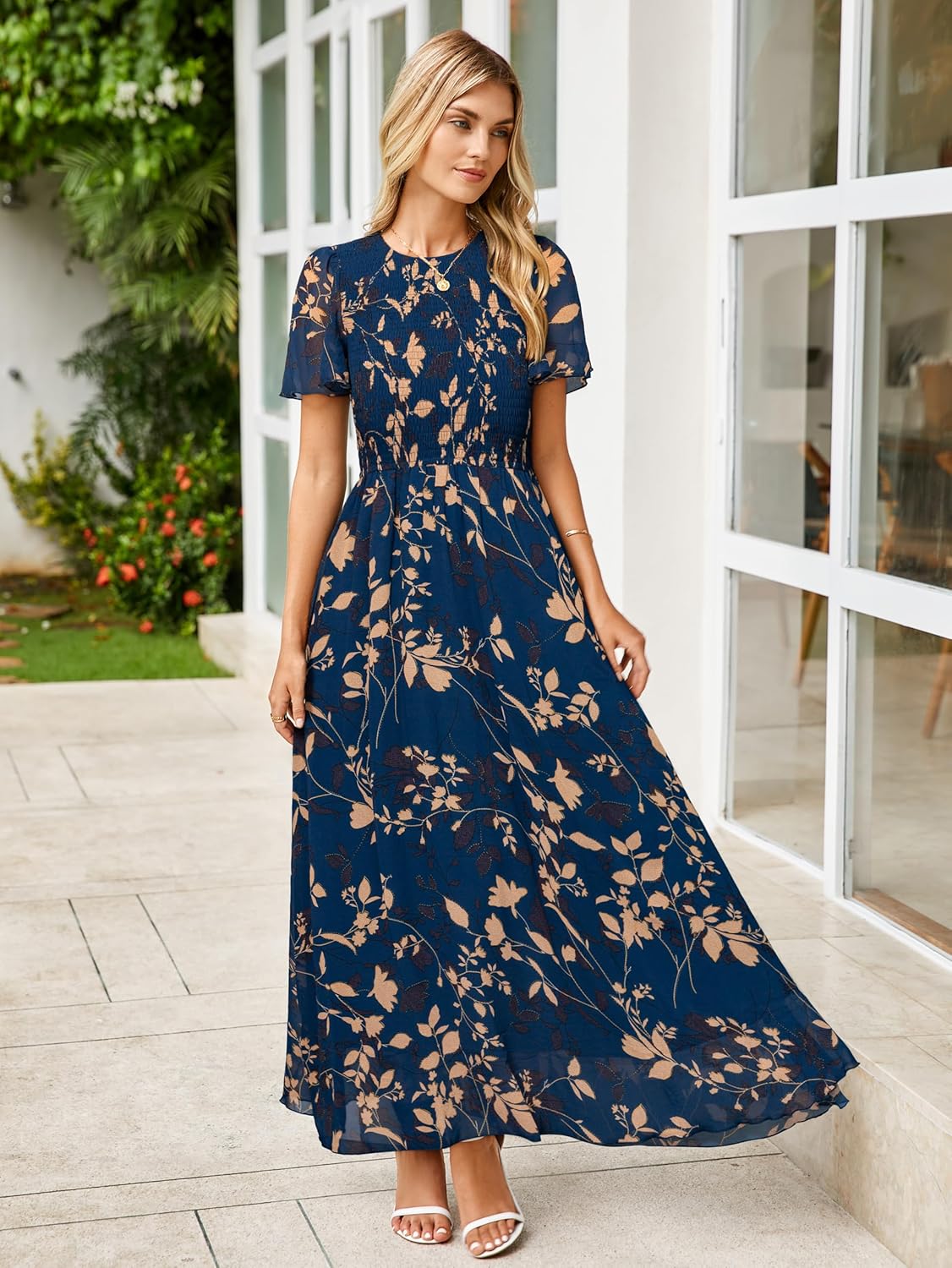 Simplee Womens Summer Floral Summer Maxi Dresses Boho Flowy Flutter Short Sleeve Crew Neck Vacation Smocked Chiffon Dress